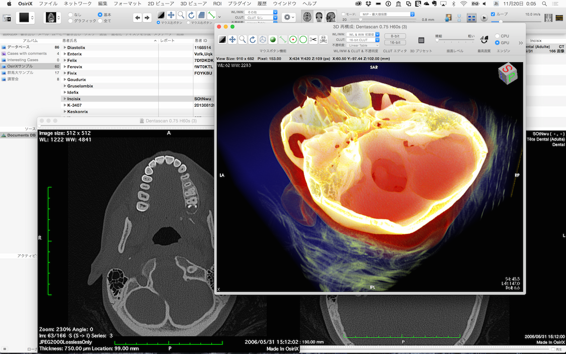 OsiriX 6.0.1 by 村上 · 公開 2014年11月20日 · 更新済み 2016年4月4日 OsiriX がアップデートされ、6.0.1になりました。日本語のメニューが追加されています。インストーラは PANDORA にあります。 OsiriX 6.0.1 関連