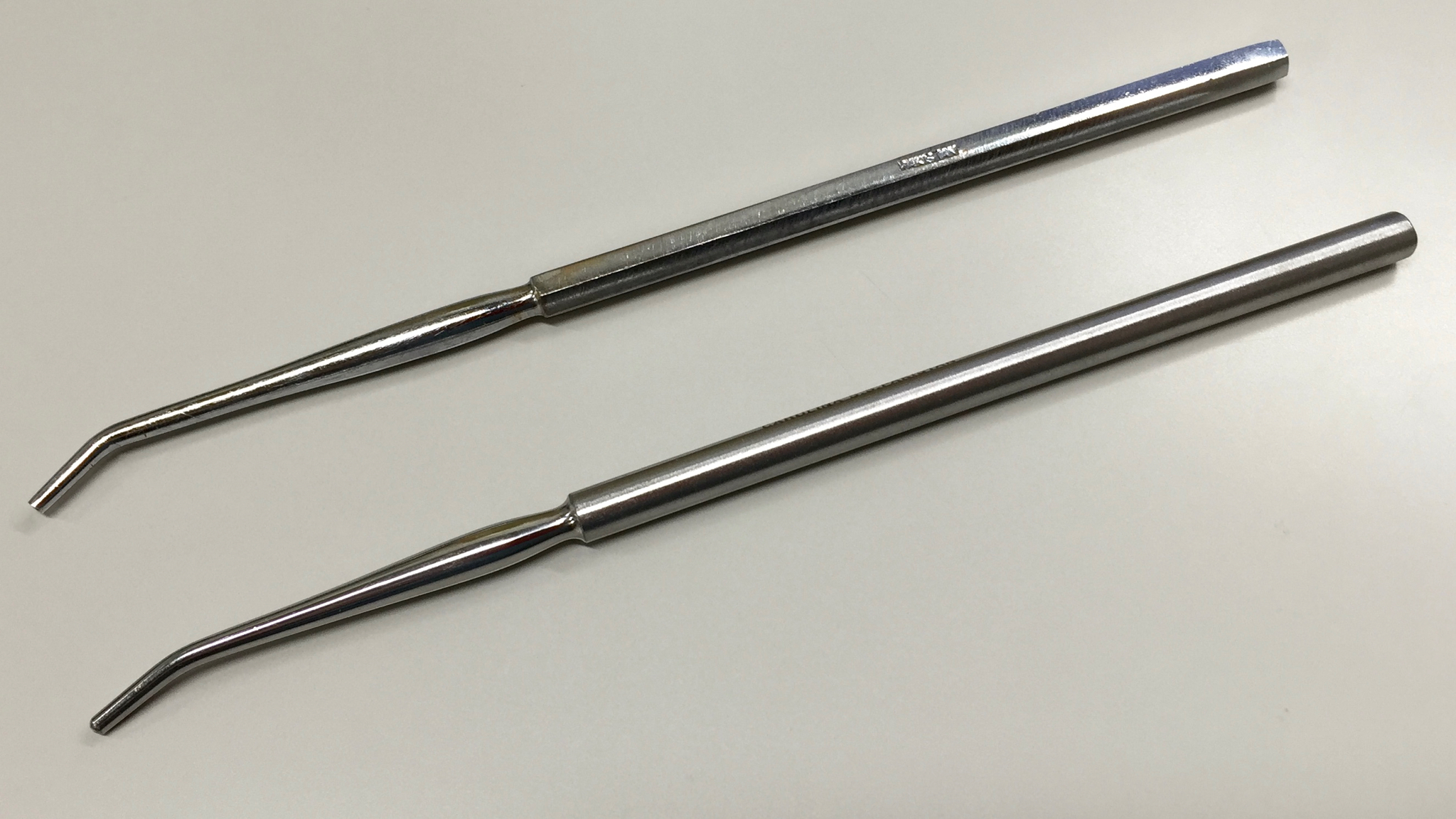 微細な剖出には細いピンセットのほうが向いているが、Mallプローブは構造物を鈍的に結合組織から剥離するのに都合よい。長さ6インチで、ステンレス棒材から削りだし、先端を少し曲げてつくられている。米国では数ドルで売られているが、日本ではみかけない。本学では米国からまとめて購入し、実習生に貸与している。