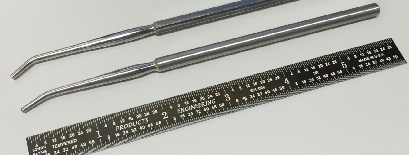 微細な剖出には細いピンセットのほうが向いているが、Mallプローブは構造物を鈍的に結合組織から剥離するのに都合よい。長さ6インチで、ステンレス棒材から削りだし、先端を少し曲げてつくられている。米国では数ドルで売られているが、日本ではみかけない。本学では米国からまとめて購入し、実習生に貸与している。