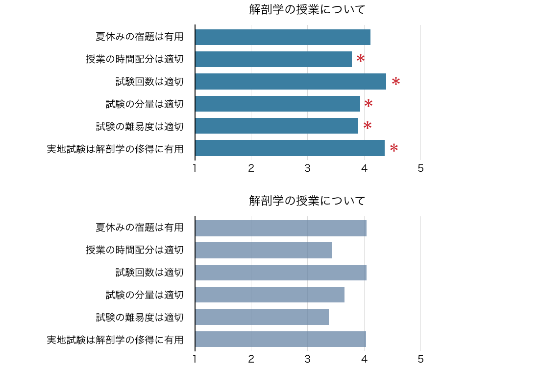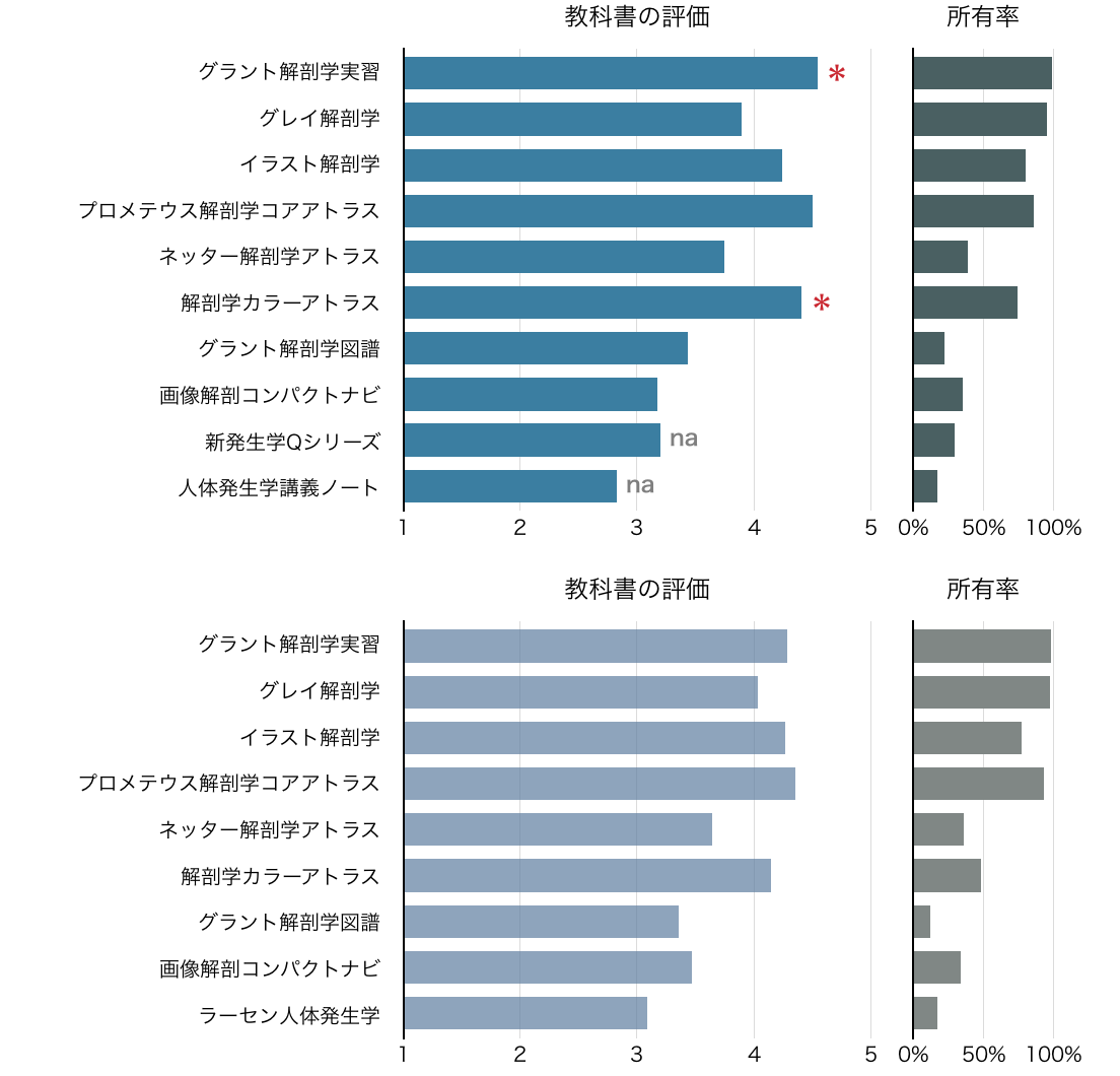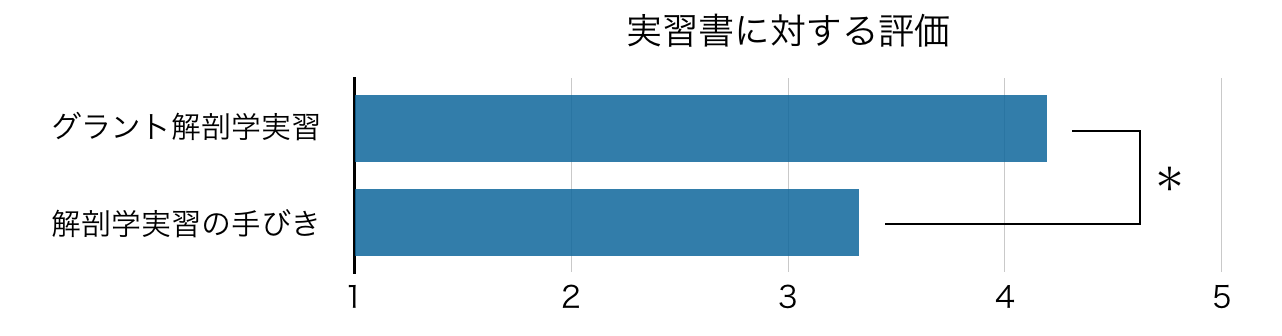 『グラント解剖学実習』と『解剖実習の手びき』の各々について、「実習書として優れている」との文に合意できるかを尋ねた。回答率100%(必須の設問)*p<0.05