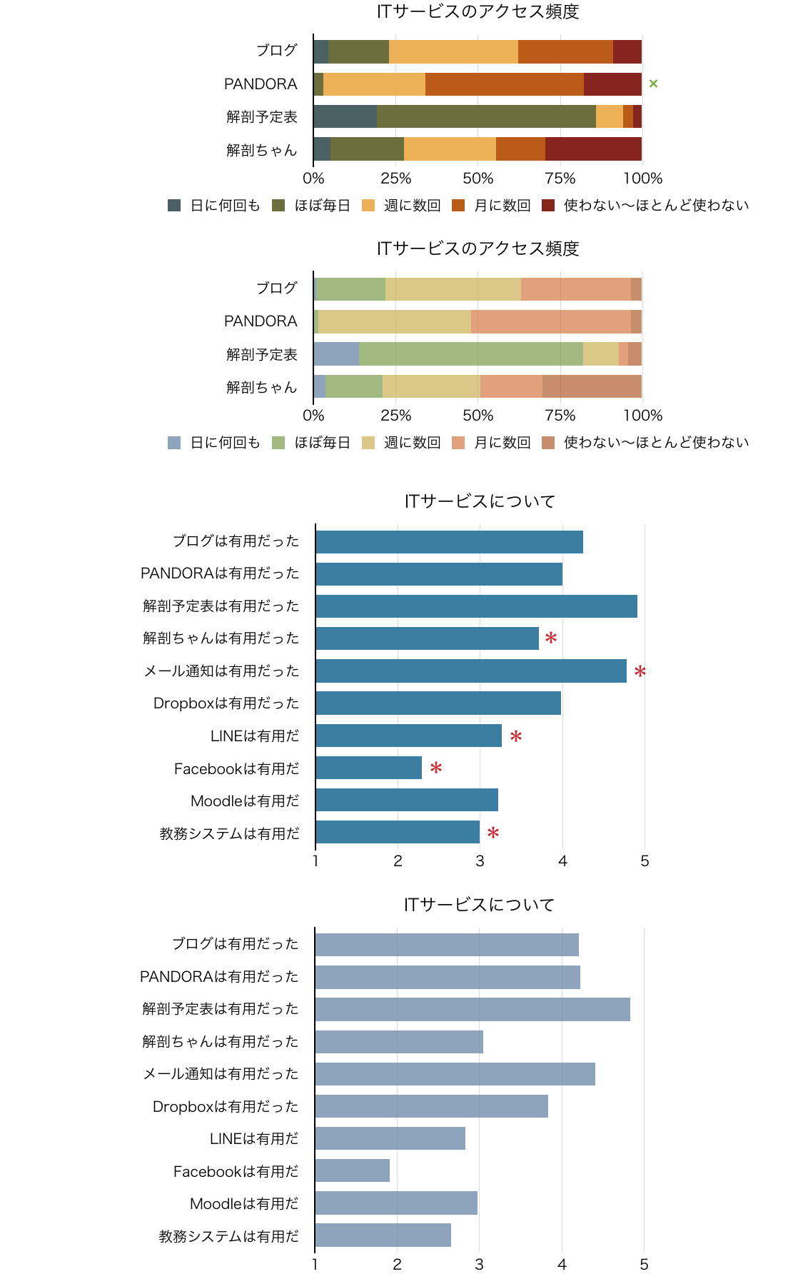 LINE、Facebook、Moodle、教務システムについては期待が低かった。いずれも採用を見送っている理由がある:LINEはブログからの自動投稿に未対応で、公式LINE@が認可されなかった。Facebookは現在の大学生には利用者が少ないとされる。Moodleは容量制限がキツく(2GB)GUIがダサい。教務システムは解剖学の授業とフォーマットが合わない。