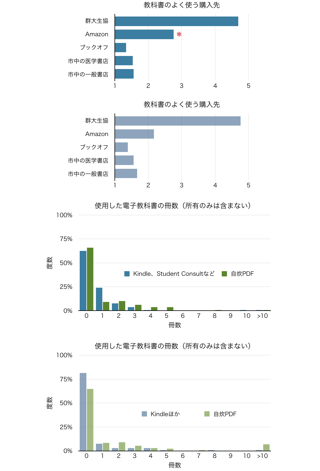 冊子体の『グレイ解剖学』の所有率がほぼ100%だったことと、今年度に使われた版から『グレイ解剖学』に日本語の電子版が付属したこと考え合わせると、今年度1冊だけ使われた電子書籍の多くがこの電子版で、冊子購入者の1/4程度が使っていたと推測される。