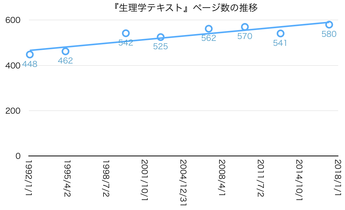 『生理学テキスト』は通読できる教科書として企画されたという。実際、初期はコンパクトだ。数年ごとに改版されている。生理学自体の発展に伴って本の分量も増加傾向だ。通読性は損なわれているが、項目ごとのボリュームはコンパクトに保たれているようだ。