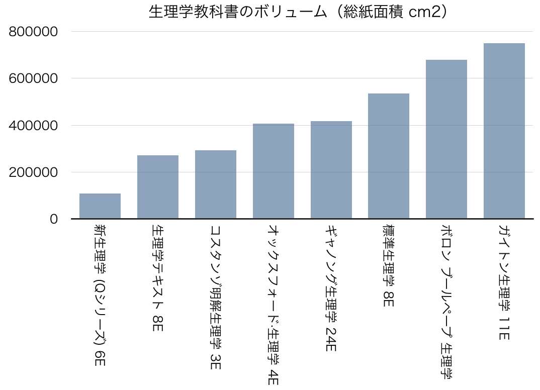 生理学の主な教科書について、判型とページ数から総紙面積を算出して比較した。『生理学テキスト』は『コスタンゾ明解生理学』と同等で、通読可能な分量の学習書と位置づけていいだろう。