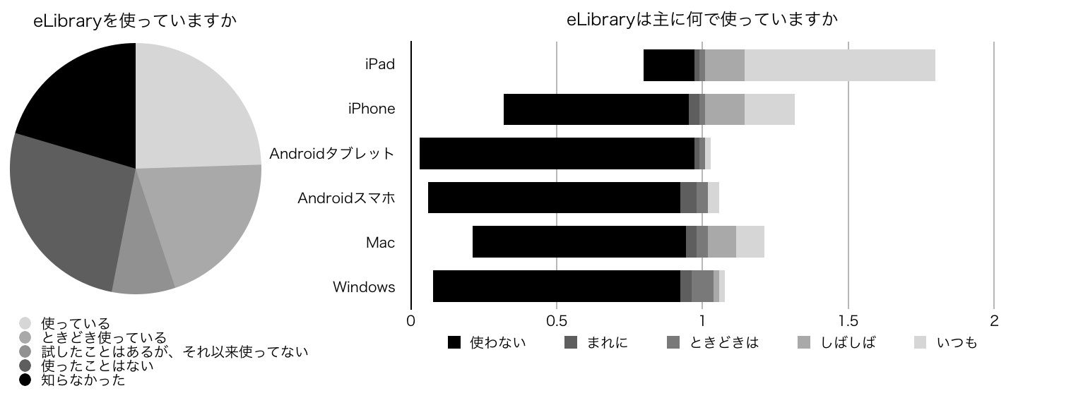 - 約半数がeLibraryを使用しており、その大部分がiPadでeLibraryを使用していた。iPhone、Macがそれに次いだ。