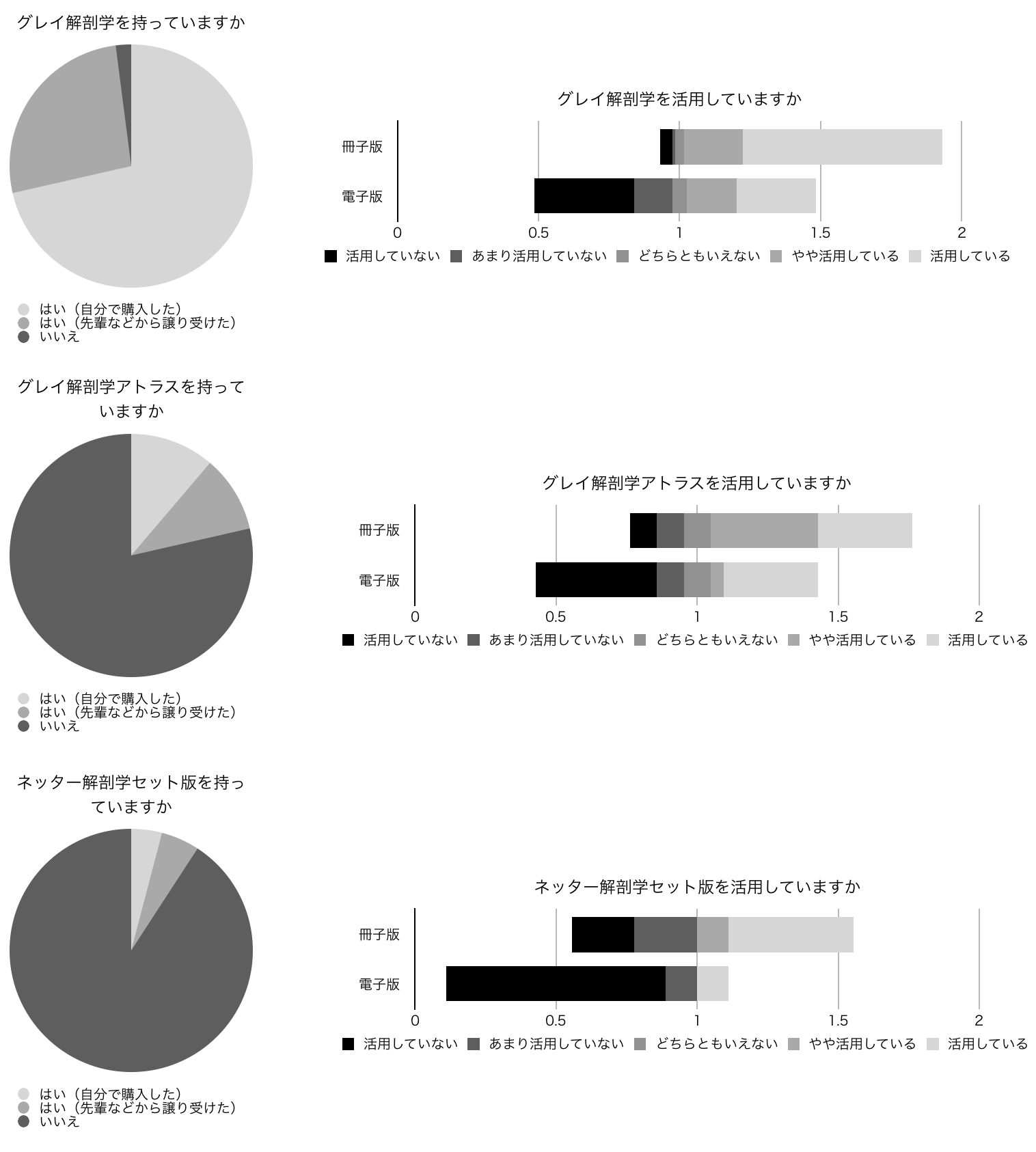 - ほぼ全員が『グレイ解剖学』を所有し、その約2/3が自分で購入した。大部分が冊子体を活用し、半数が電子版を活用していた。