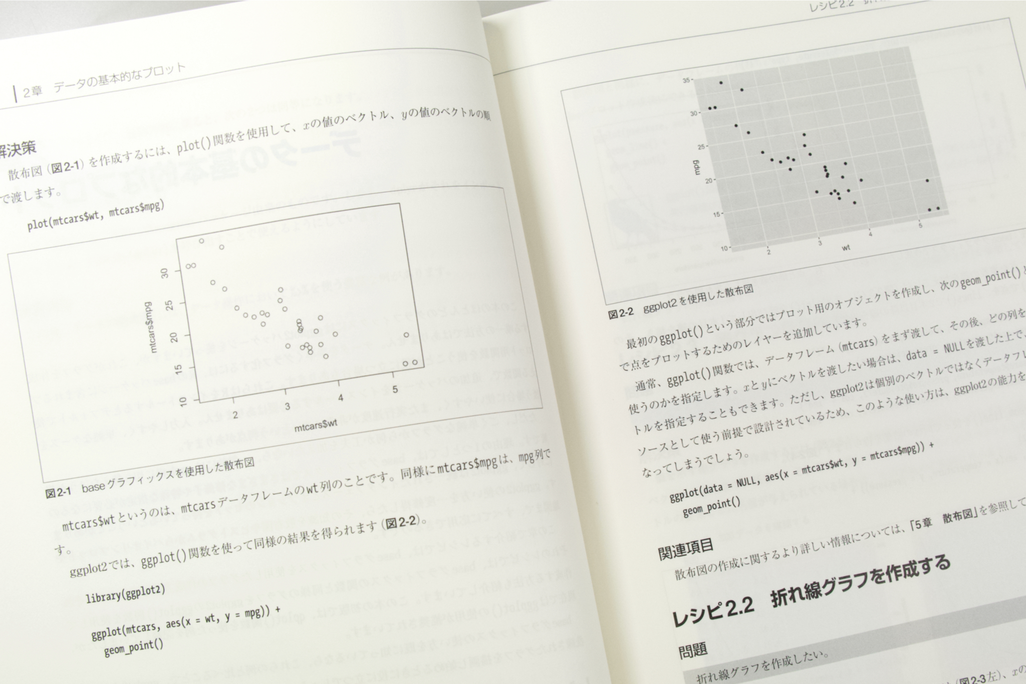 第2章はプロットの基本。基本的なグラフに関して、baseパッケージのplot関数とtidyverseのggplot2とが対比される。