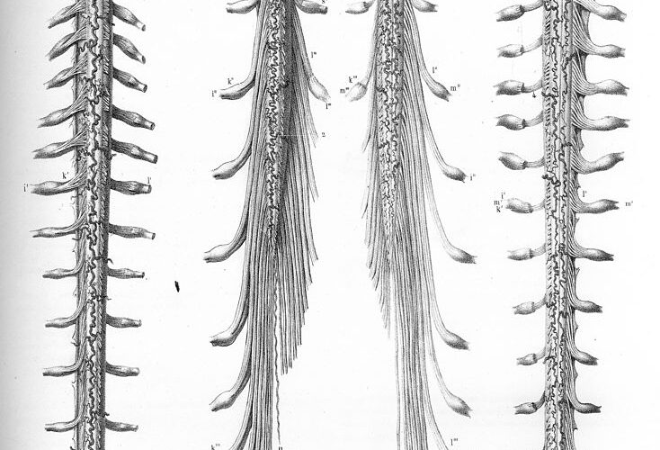 • 前根と後根、歯状靭帯、後根神経節、前枝と後枝