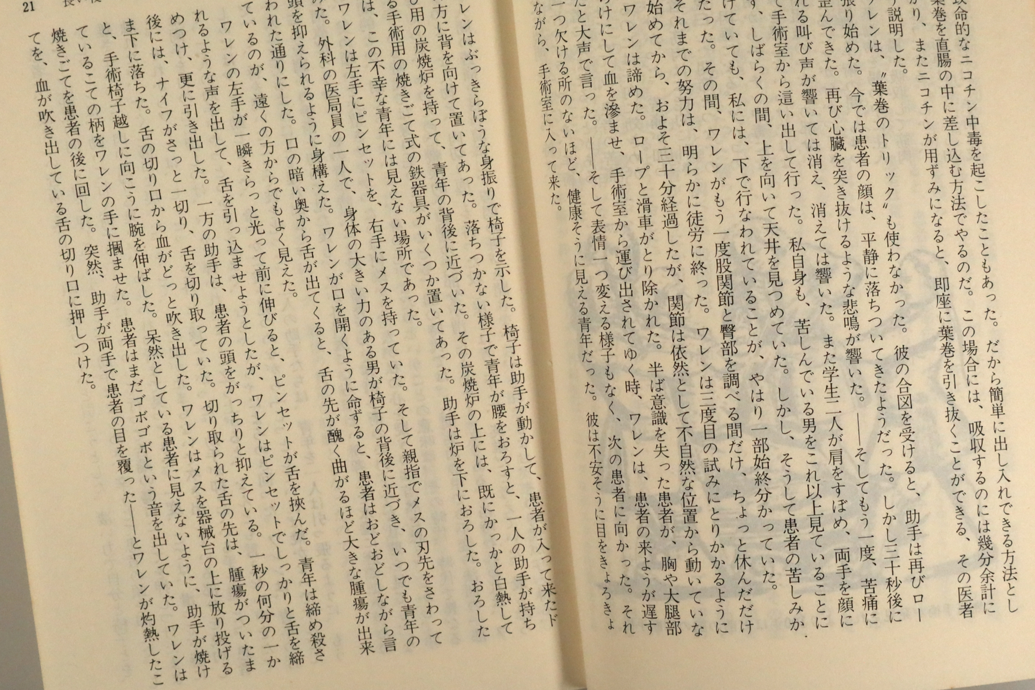 塩月訳、大野訳は抄訳で短い分、時代のダイナミクスがより感じられる。塩月訳の文庫判は、確認できたうちでは1981年の第9刷まで続き、多くの医学生を刺激した。これを読んで外科医を志したという人もいる。本学図書館にあるのは、そのような外科教授の推薦によって古書のマーケットから図書館が収蔵したものだ。塩月訳、大野訳とも絶版になっていて、状態のよい古書には数千円〜数万円のプレミアがついている。再販されるといいが。