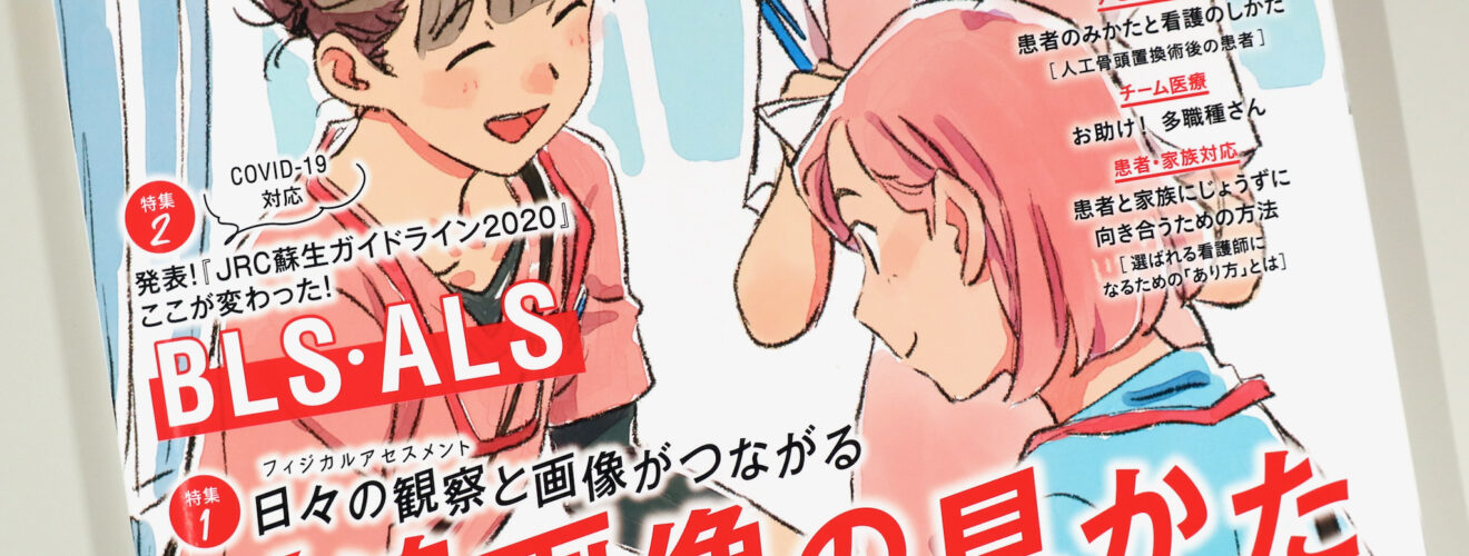 表紙のイラストは、肘窩の静脈への注射の練習。シミュレーターに針を刺しているところを看護実習生が熱心にみている。4月号から始まった成長物語も、もう後半だ。