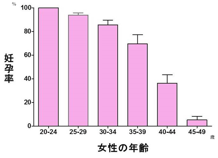 女性の年齢と妊孕力の変化:妊孕率は、女性1,000人あたりの出生数(17~20世紀のアメリカ、ヨーロッパ、イランなど10ヶ所のデータ:Henry, L. (1961). Some data on natural fertility. Eugenics Quarterly, 8(2), 81-91.)を元に、20-24歳を100%として計算した。年齢の増加に伴い(特に35歳以降)妊孕率の低下が認められる。データは平均±標準偏差で示した。(2016年12月12日一部内容を改訂)日本生殖医学会より