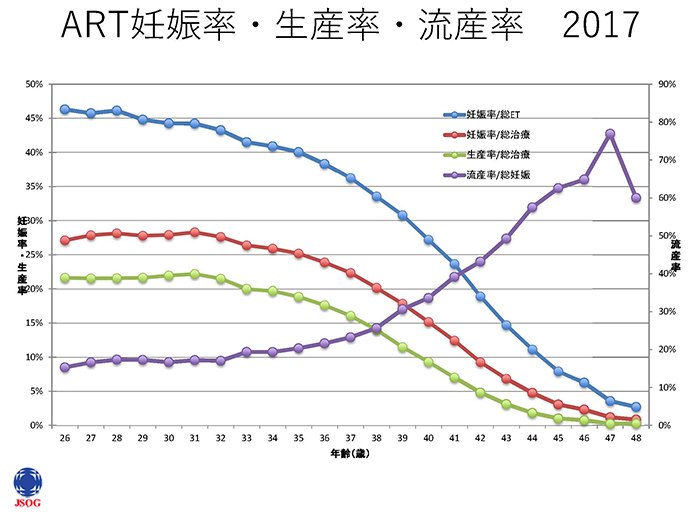 (http://plaza.umin.ac.jp/~jsog-art/2017data_20191015.pdf)。日本産科婦人科学会 ARTデータブック2017)。年齢の増加に伴い(特に35歳以降)妊娠率・生産率の低下と流産率の増加が認められる。ET:胚移植。日本生殖医学会より