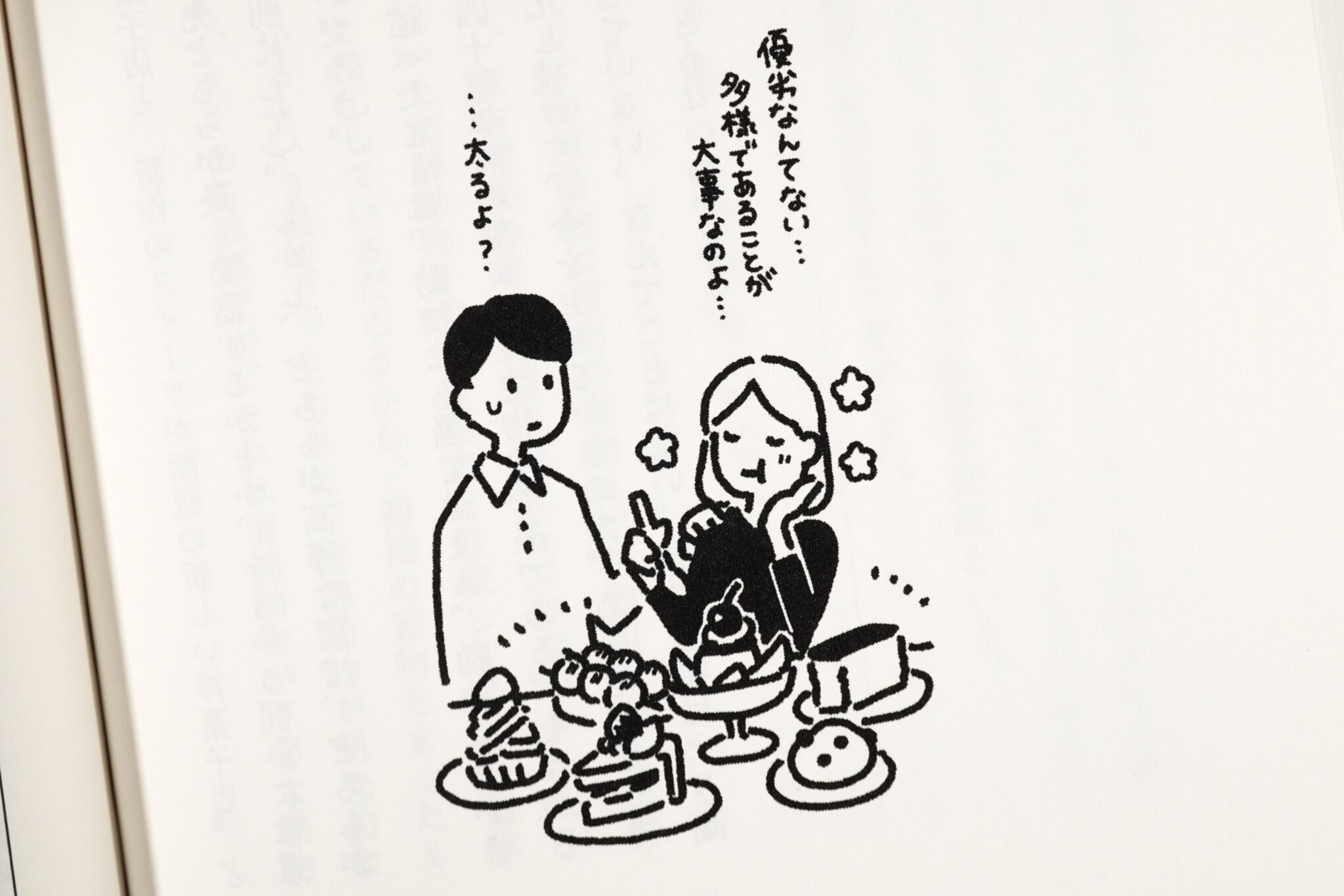 若い恋人たちらしいキャラクターが描かれたイラストが、本文中や章末にある。どうやら、この本を読みながら感心したり感動していたりする読者ということらしい。
