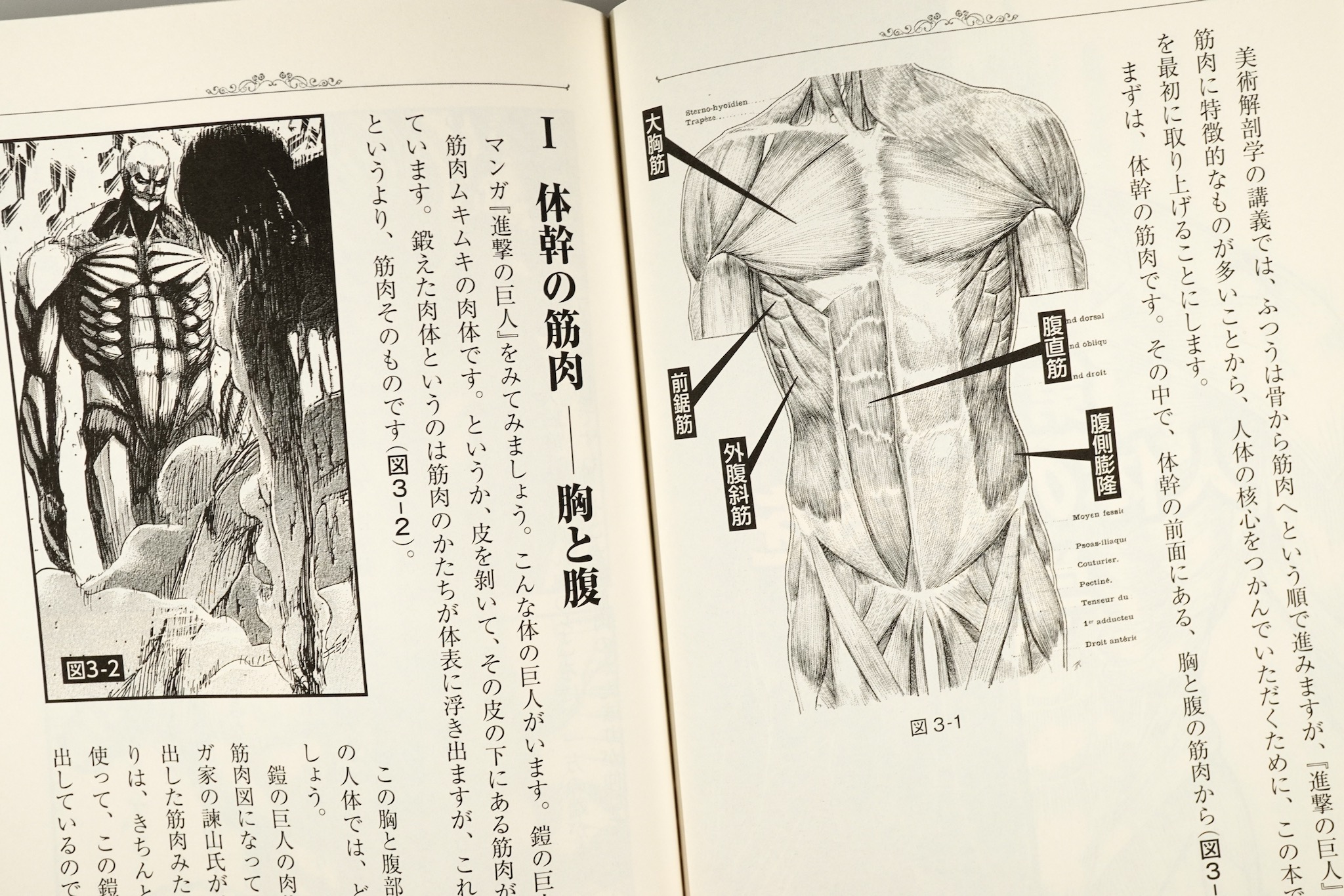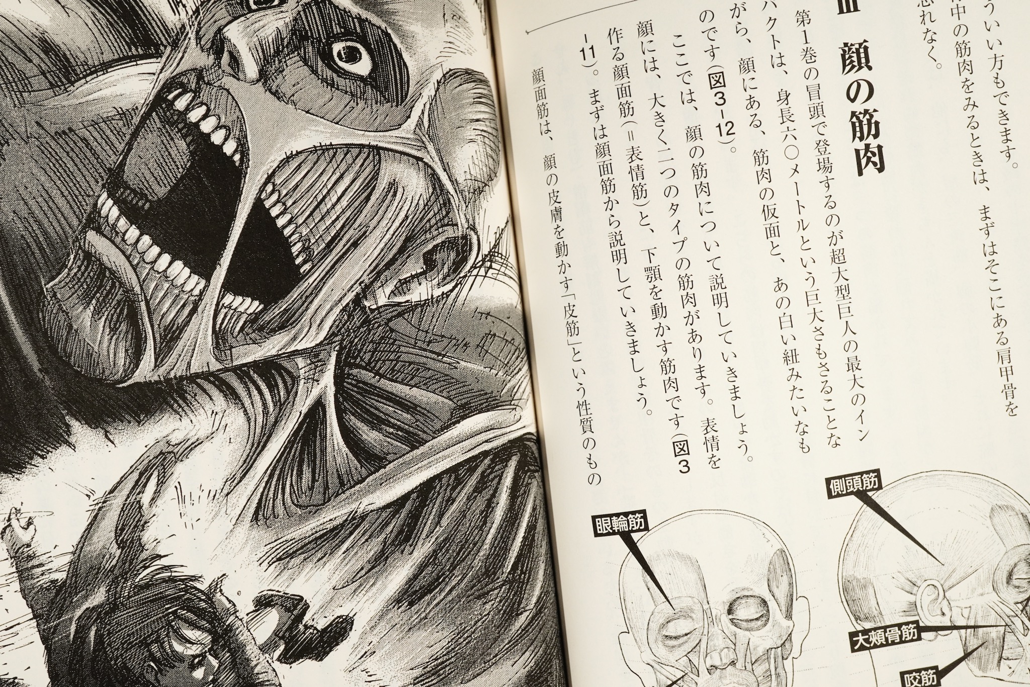 『進撃の巨人』の巨人は、人体っぽさを踏まえながらも、実在し得ないような構造を創作しているわけで、それによって恐怖や不快感が増している。そこを敢えて巨人たちの解剖を、人体解剖学に基づいて検討していく。