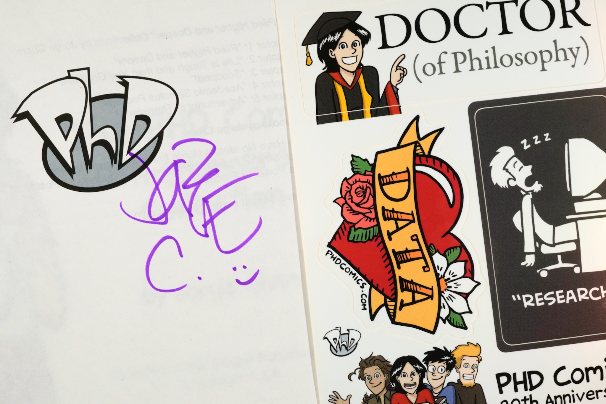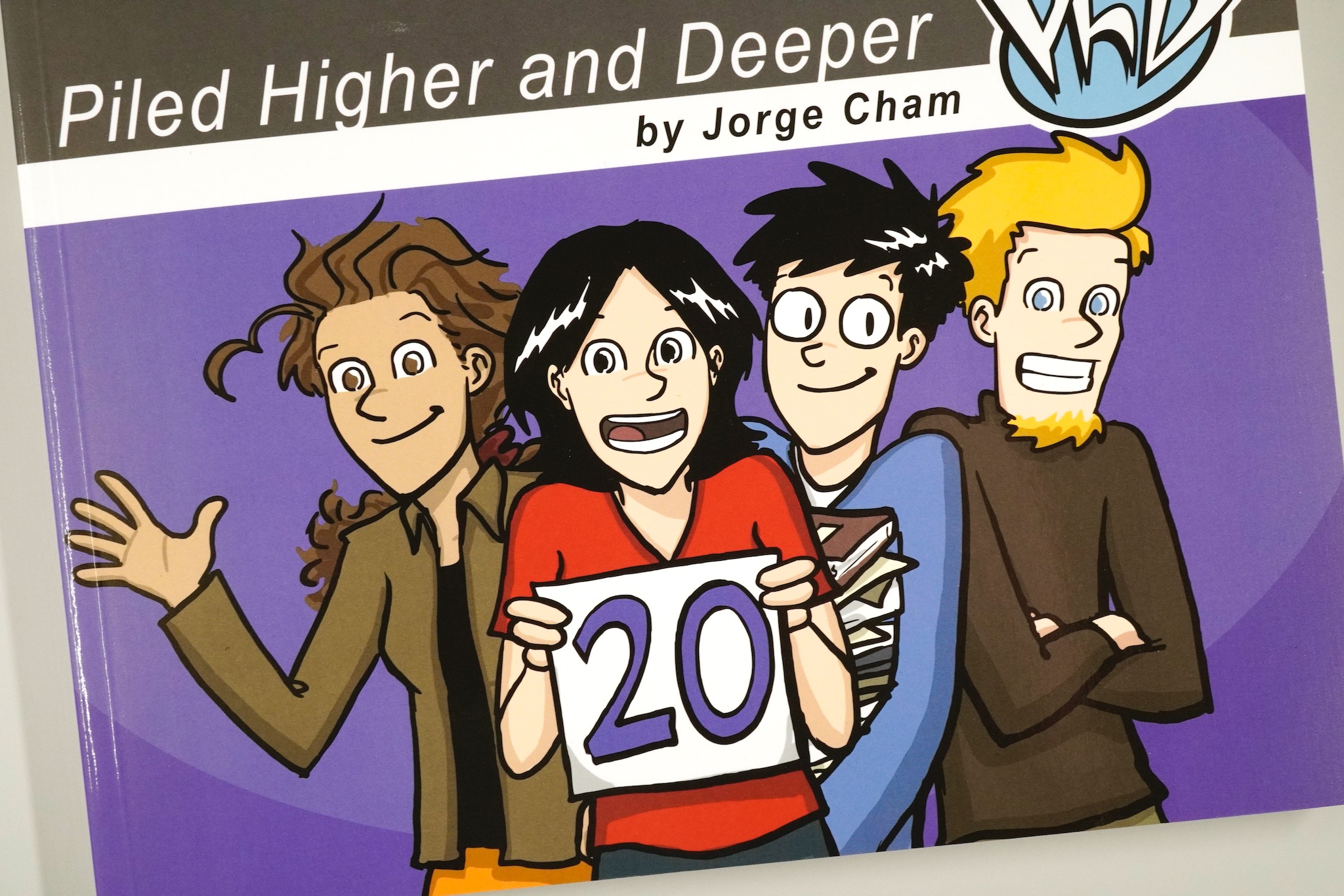 「Piled Higher and Deeper」は、博士論文を書こうと集めた本や参考文献が、机や床に堆く積み上げられたようすのこと。略してPHD。1997年にスタンフォード大学の大学院生だったJorge Chamが、大学新聞の絵師の募集に応募して始まった。