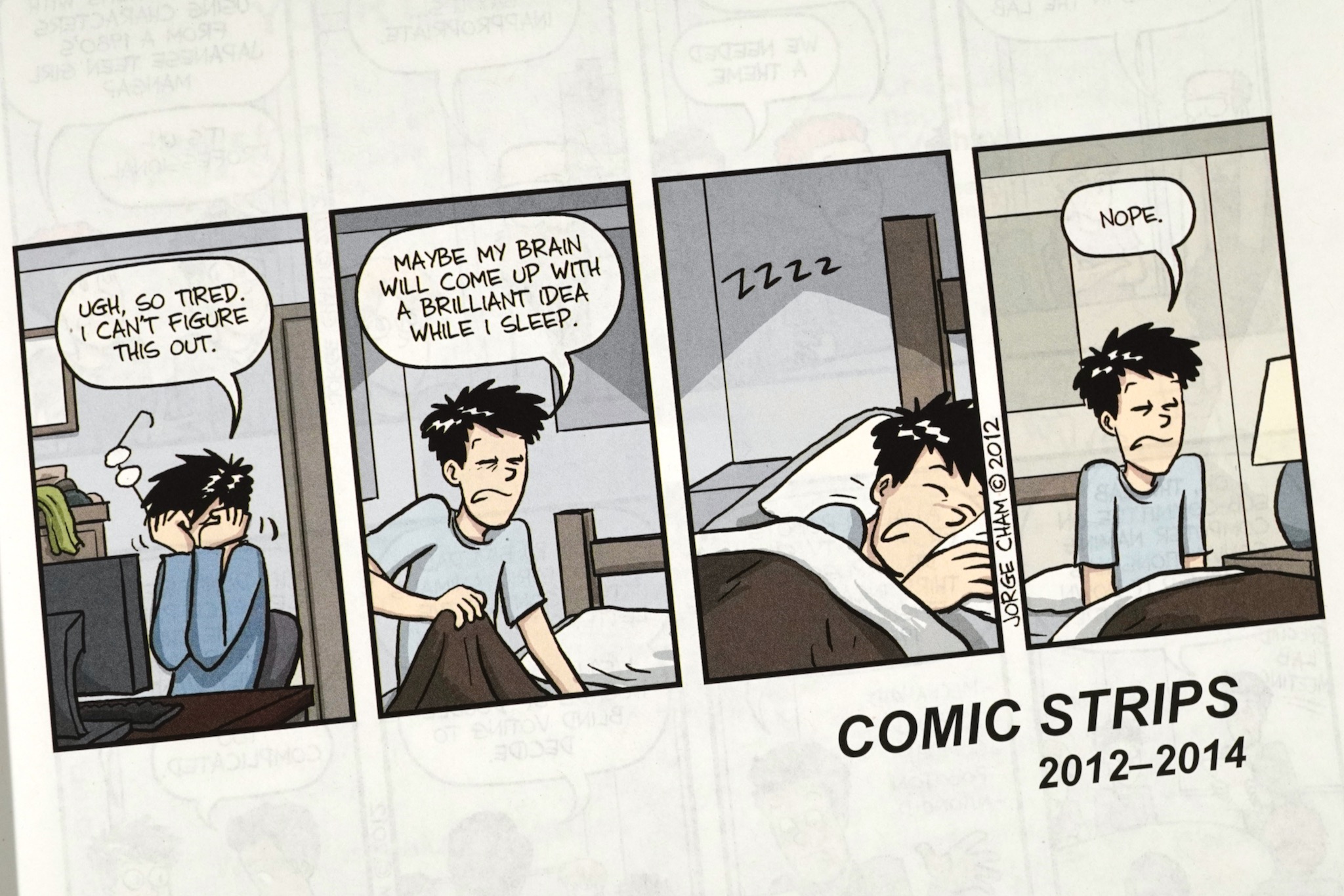 「The Power of Procrastination」は作品解説のエッセイ。「Procrastination」は、ぐずぐず先延ばしすること。PHD Comics全体に一貫する考え方で、Procrastinationはむしろ斬新なアイディアの源泉であるという。(物語の舞台が、教員にノーベル賞受賞者が複数いる名門校であることに注意し、ことば通りに都合よく解釈しないこと。)