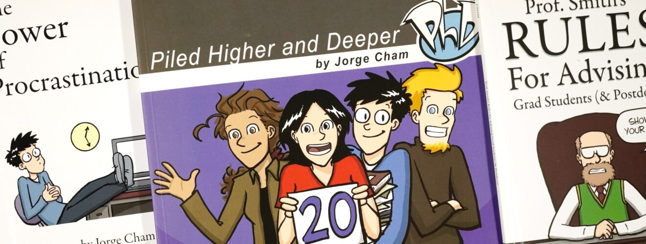 「Piled Higher and Deeper」は、博士論文を書こうと集めた本や参考文献が、机や床に堆く積み上げられたようすのこと。略してPHD。1997年にスタンフォード大学の大学院生だったJorge Chamが、大学新聞の絵師の募集に応募して始まった。