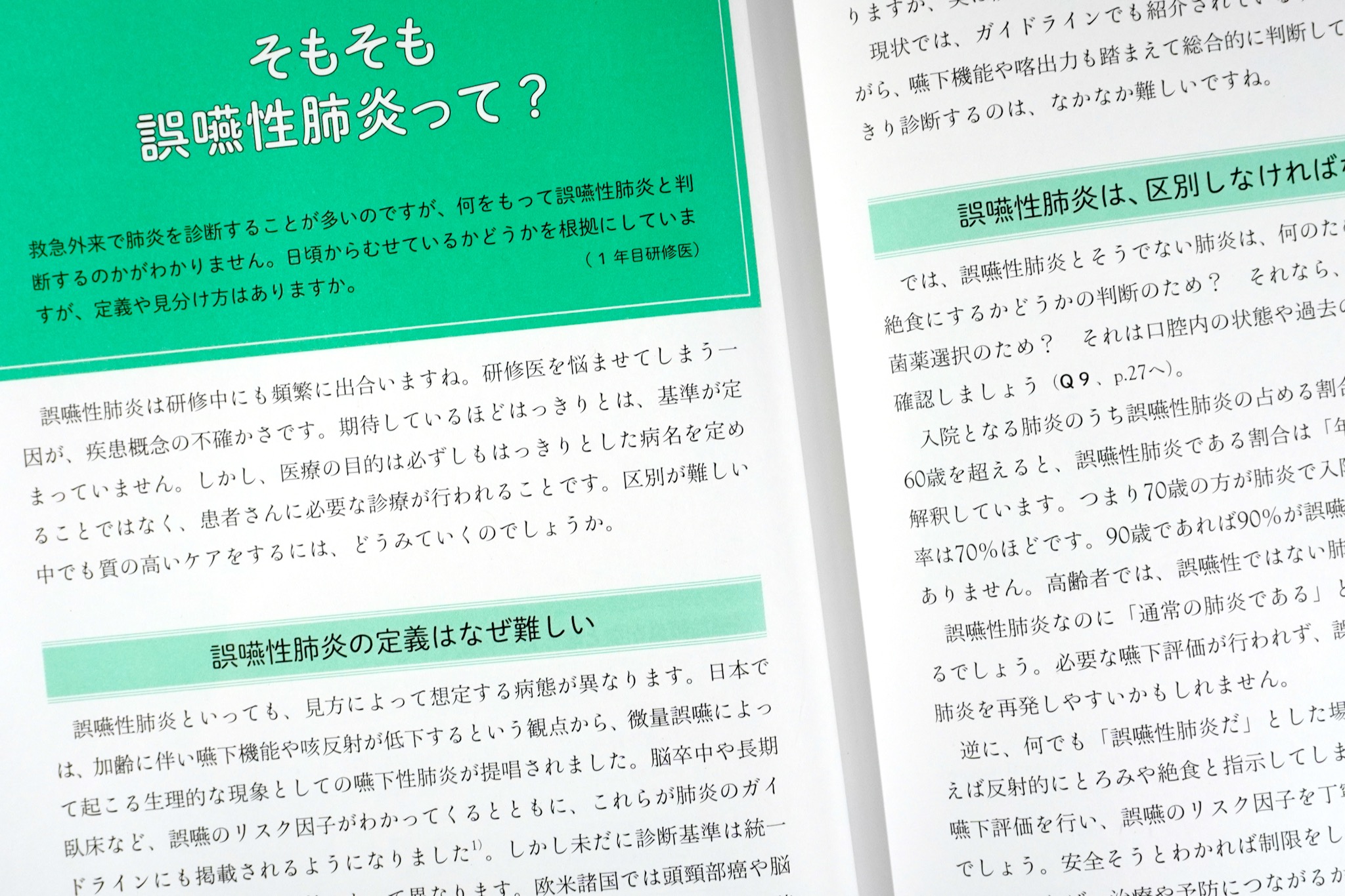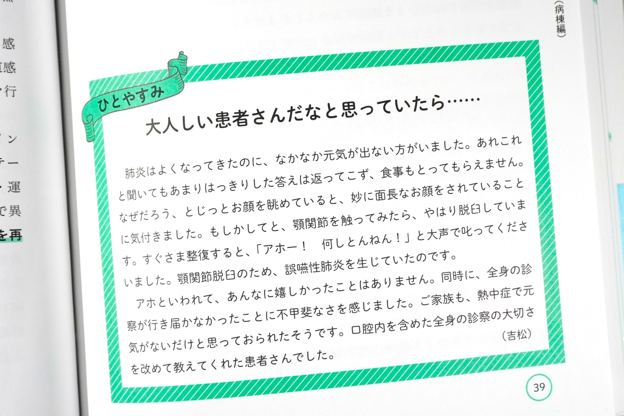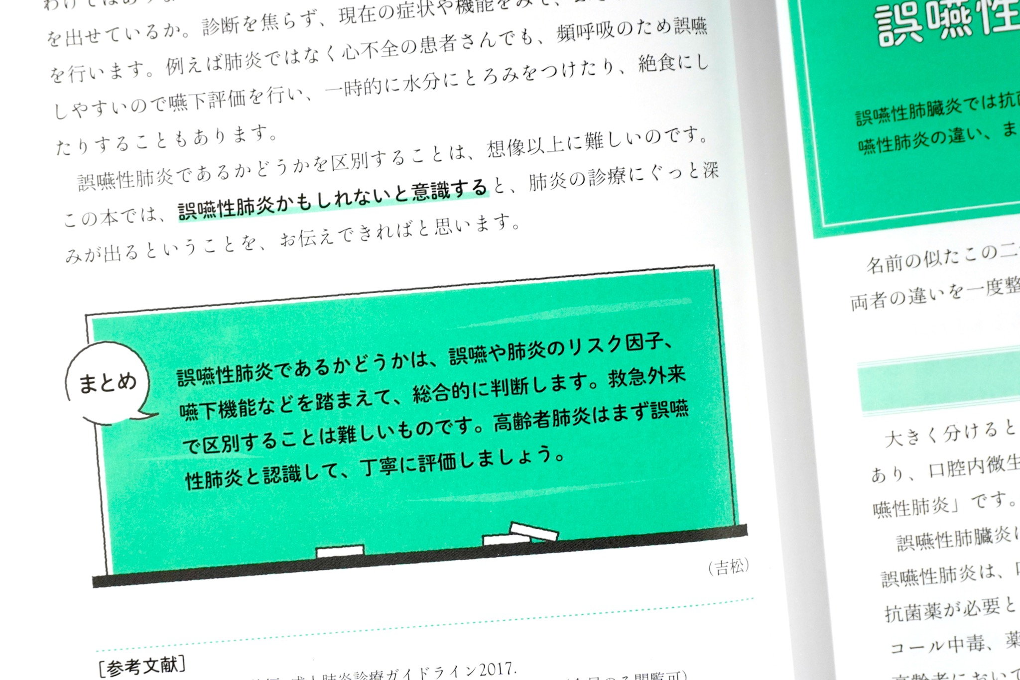 いくつか、著者の経験したエピソードが「ひとやすみ」というコラムで紹介される。「ひとやすみ」と親しみやすそうな振りをしているが、実は誤嚥性肺炎に限らず診療の本質を例示している。