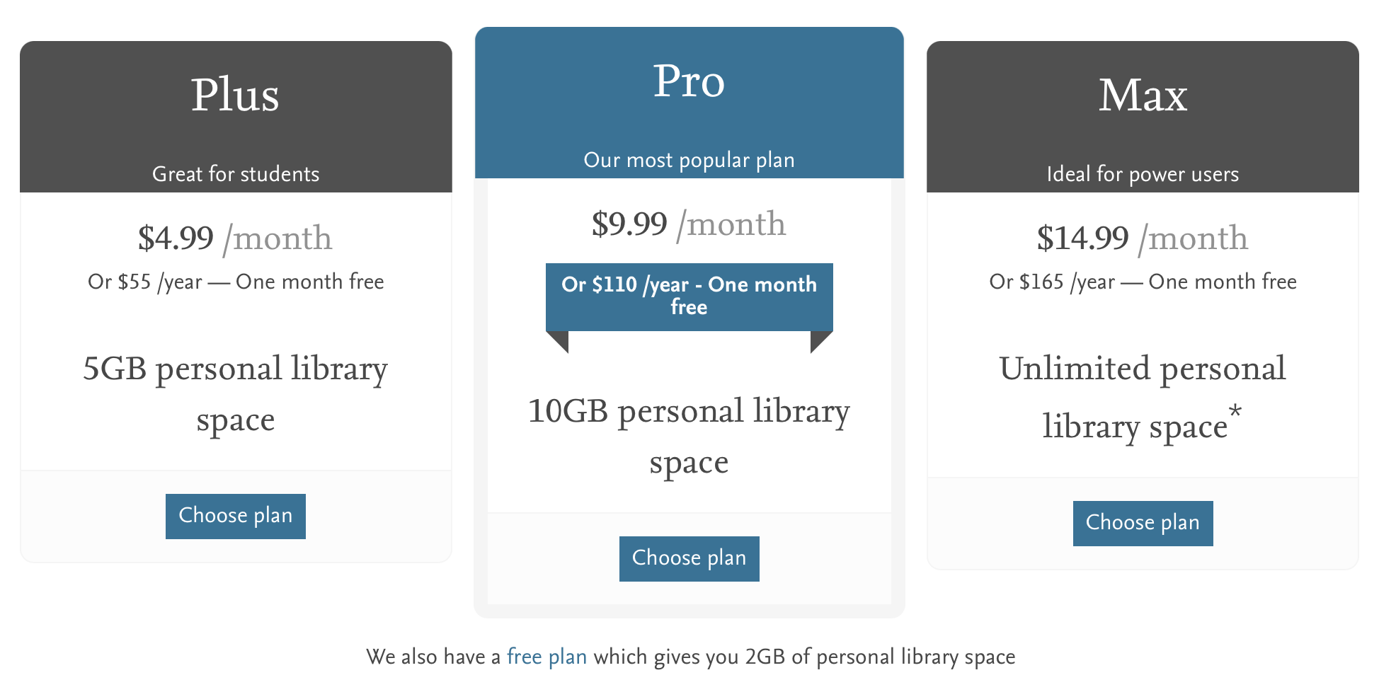 サブスクリプション形式の課金制で、容量制限はない。無料のお試し期間(30日間)がある。学生や教育機関、旧Papersユーザにはディスカウントがある。もとのPapersが売り切りだったので、サブスクリプションになったのを敬遠する向きもある。最初のReadCube Papersはまだ貧弱だったが、現在は改善が進み、クラウドならではの機能が増えた。