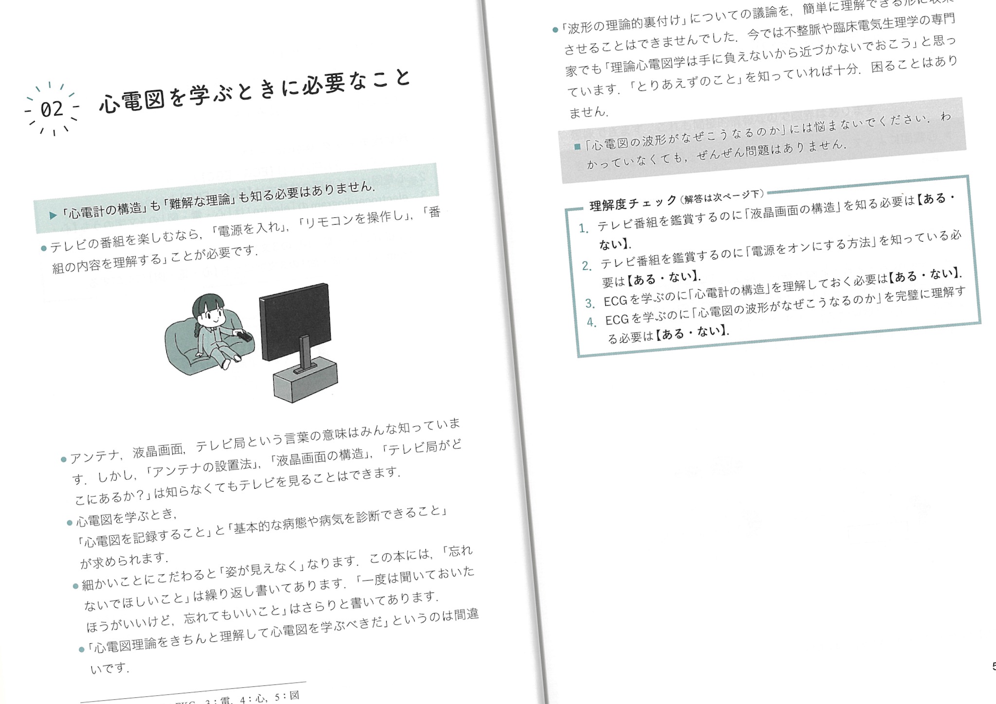何かを勉強するとき、理屈の沼にハマらないように「この先危険」と教えてくれるメンターがいると助かる。そして「実は本人もわかってないんじゃないの?」と疑われてしまうようではいけないので、メンター自身はちゃんとした理論家であってほしい。本書はそういうメンターの代わりになるだろう。5時間を読書に使ってみよう。本当に全く心電図がはじめてということはないだろうから(生理学で膜電位からやった)、知っているところも多くあるはず。