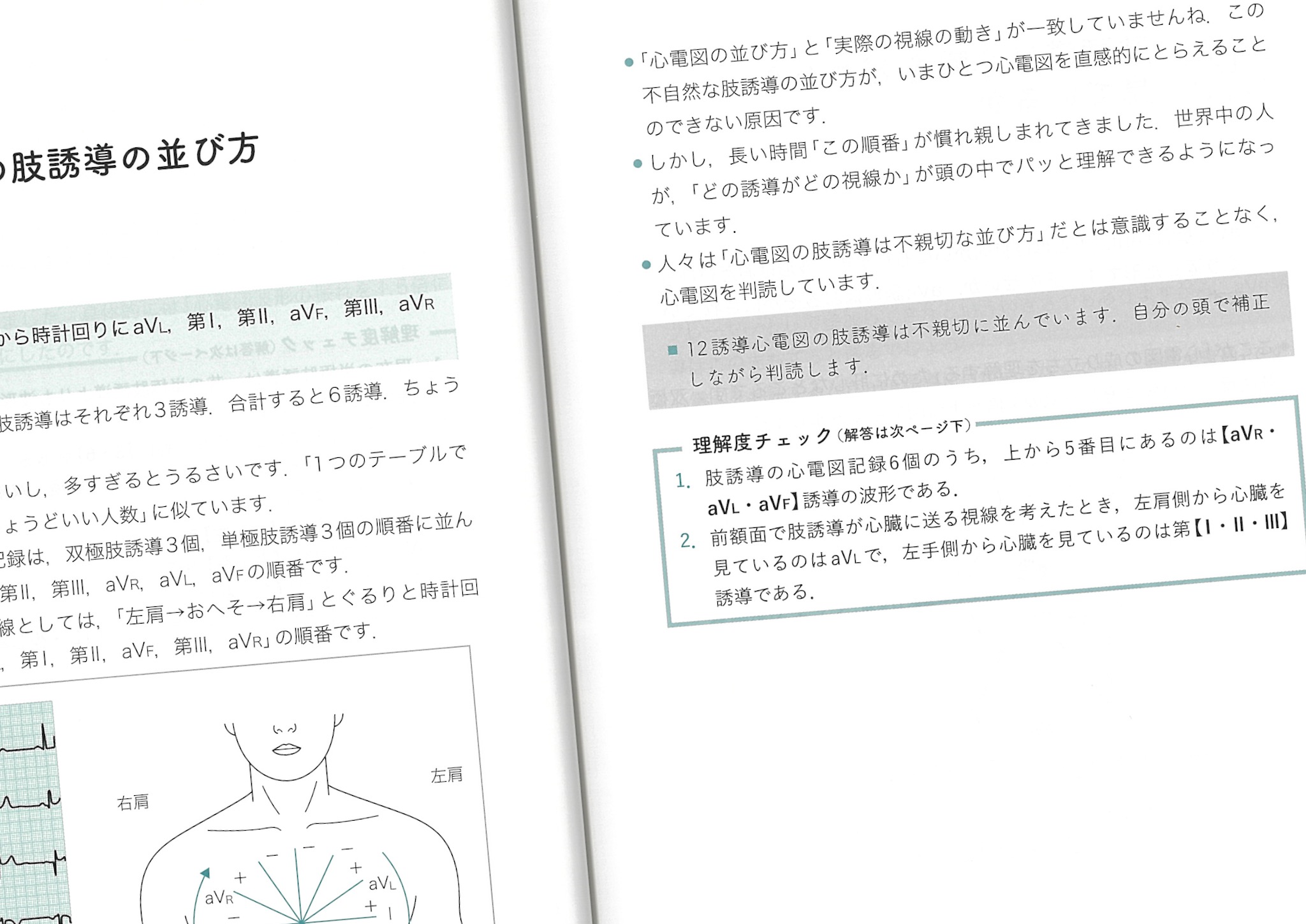心電図でできること・できないことがまず書いてあって、ありがたい。心電図の立派な本を見ると、心膜炎とかファロー四徴症とかもでてくるわけで、そんなのまで心電図で読めないといけないの? とモチベーションが下がる。そこは心電図より先にエコーでしょうよ、といってもらえたら、悩まずに済むというものだ。