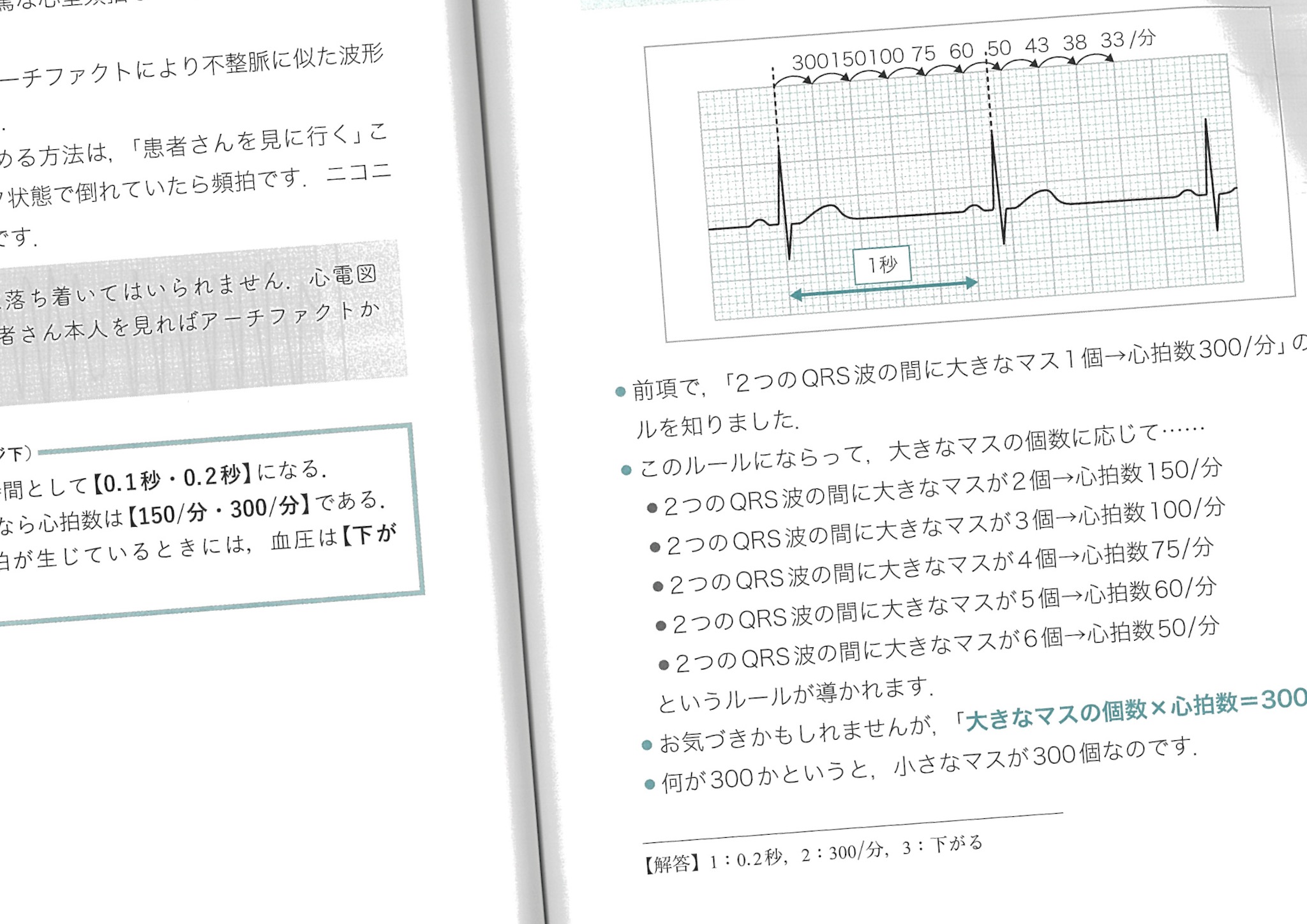 チラ見で心電図をよむための最低限覚えておくこと、最低限覚えておく数値は、繰り返しでてくる。たとえば、心電図の方眼の太枠(5mm四方)、横が0.2秒で、縦が0.5mV、RRが5mmなら300/秒、など。こういうのは、練習でみにつけるのだろう。