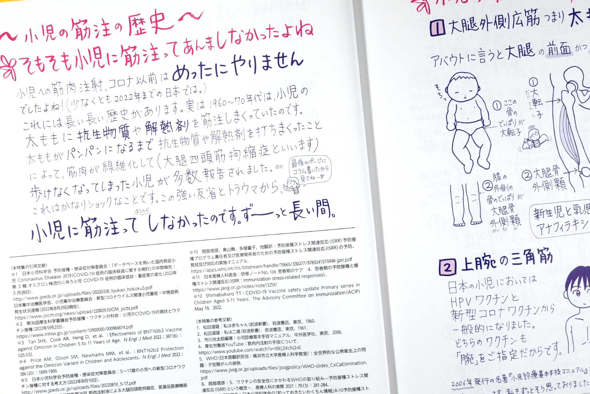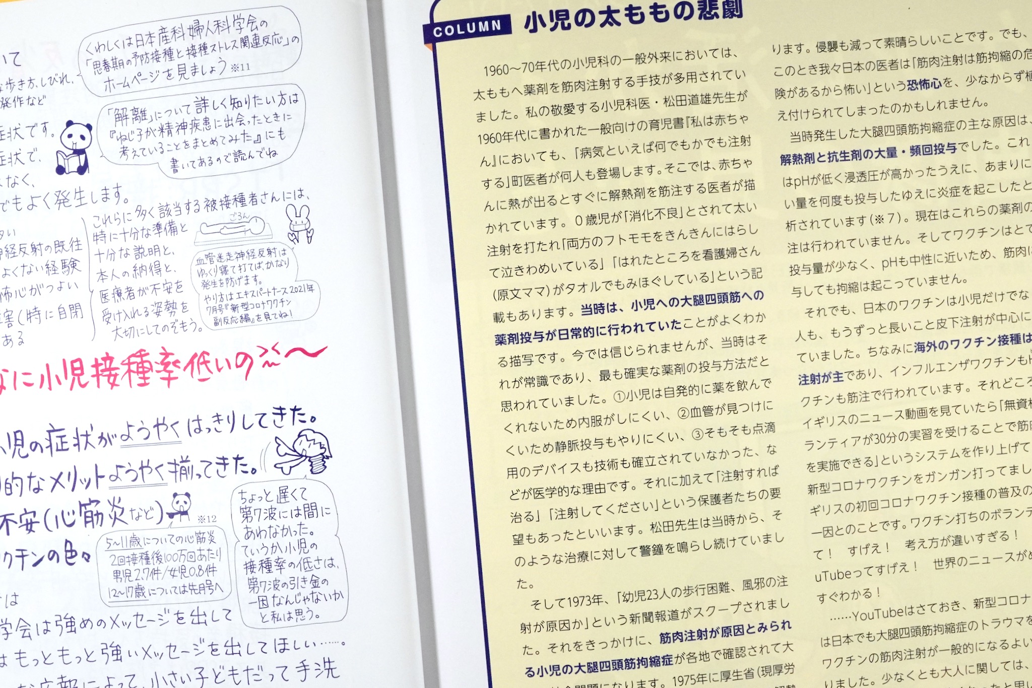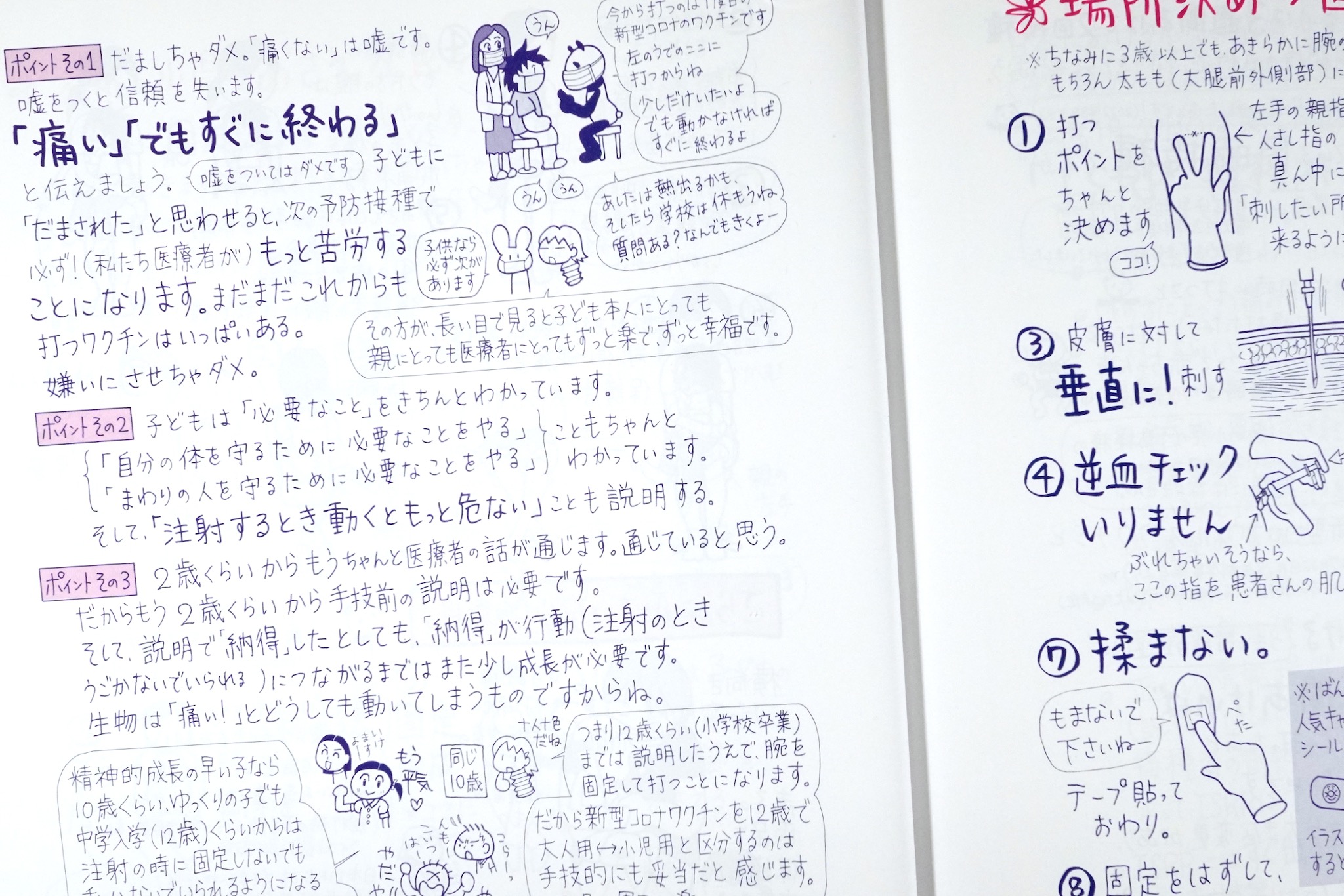 医療関係者も、ワクチンを受ける人たちも、疑問や悩みの多いポイントをイラストと手書き文字で解説する。つらい医療の歴史も踏まえてある。