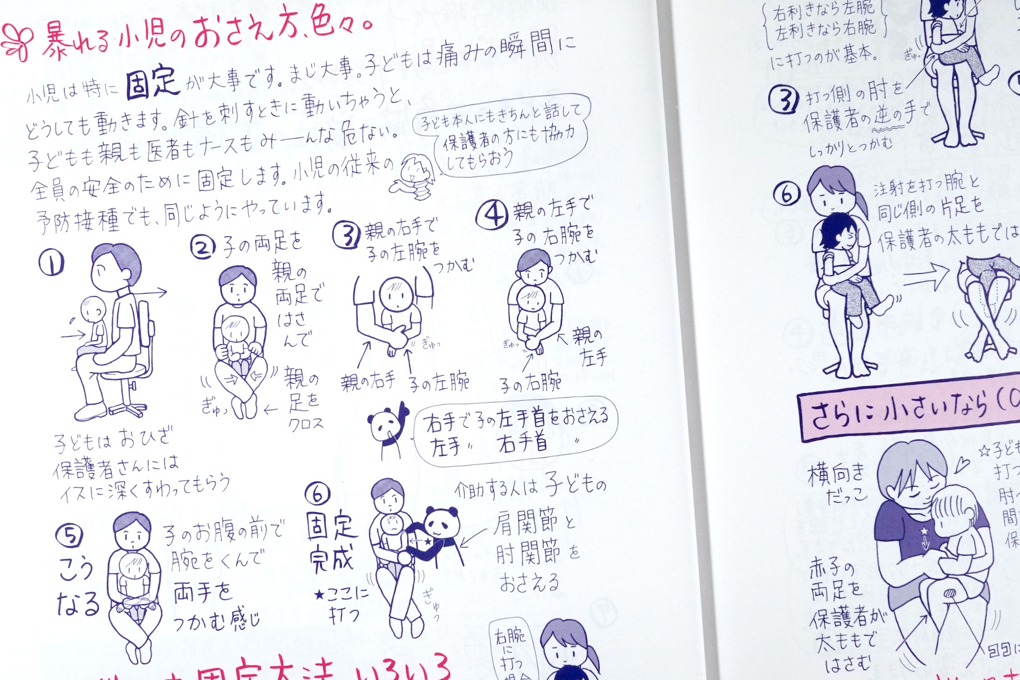 小児の注射で大切なことは、よく固定すること。でないと、子どもも周りも全員危険。具体的にどうするのか、いろいろなパターンを解説してある。イラスト入りで、よくわかる。