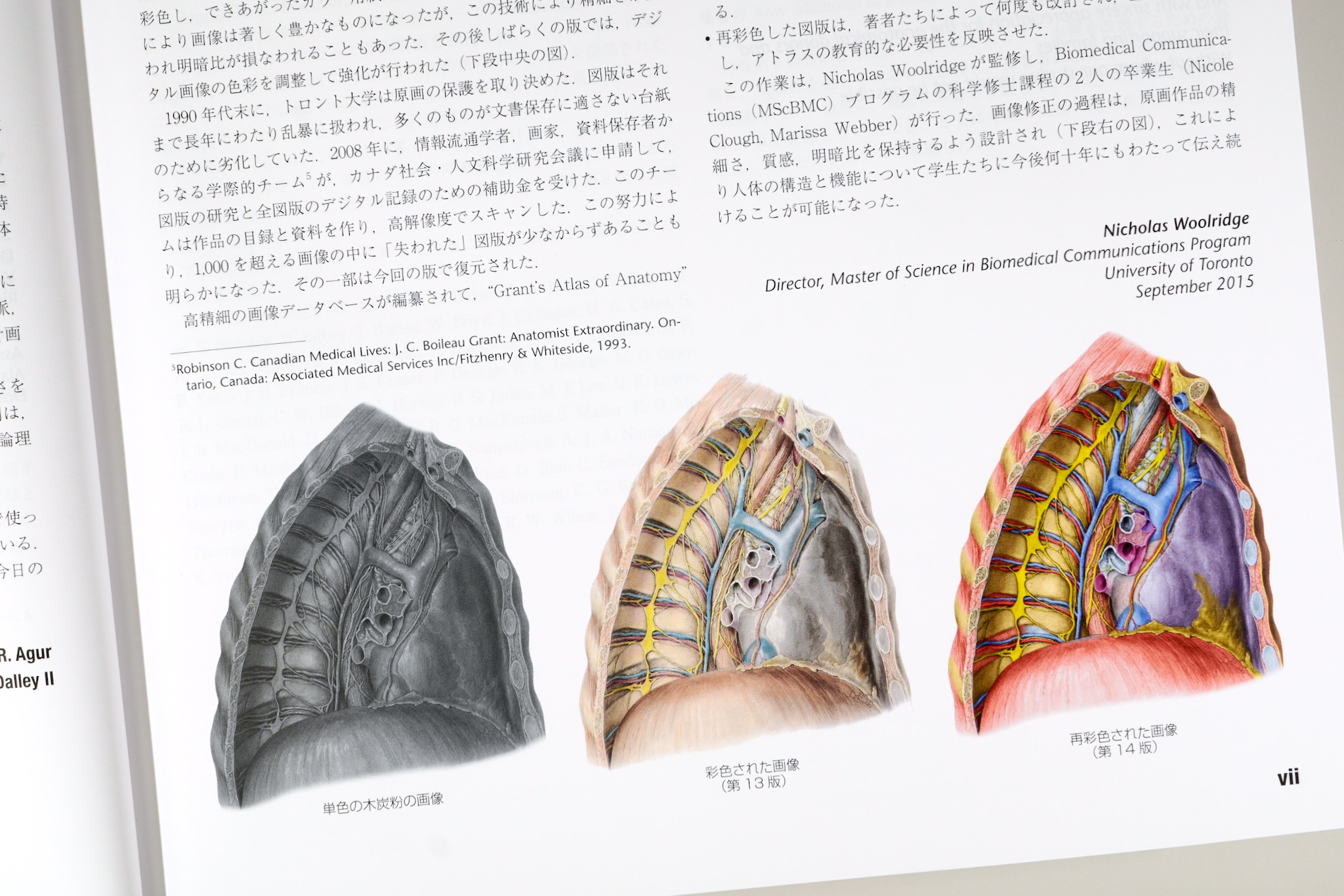 『Grant’s Atlas of Anatomy』の初版の図のほとんどは、Dorothy Foster Chubb氏が1年間で仕上げたもの。実際の解剖標本を木炭画で細密に描いた。その後、Nancy Joy氏、Elizabeth Blackstock氏などのイラストレーターが図版制作を継続した。比類なく精密なこれらのイラストは現在の版でも使われている。