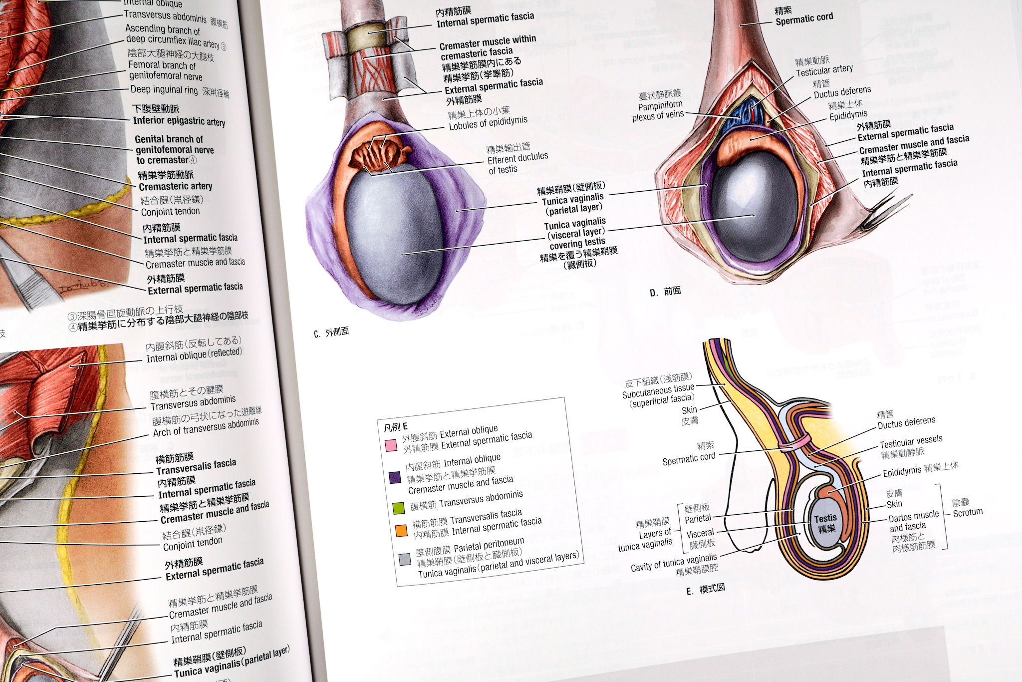たとえば、鼡径管・精索の部分。実際の剖出や手術のようすに近いリアルなイラストではあり、そのこと自体はよいのだが、膜の成り立ちの模式図がわかりにくい。