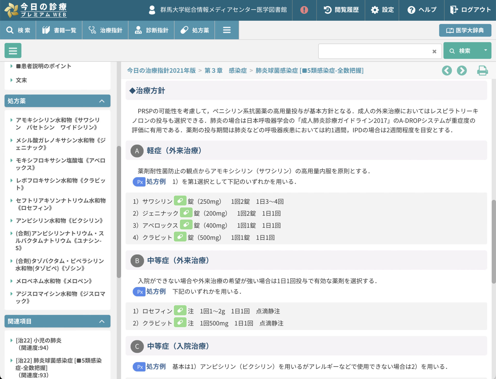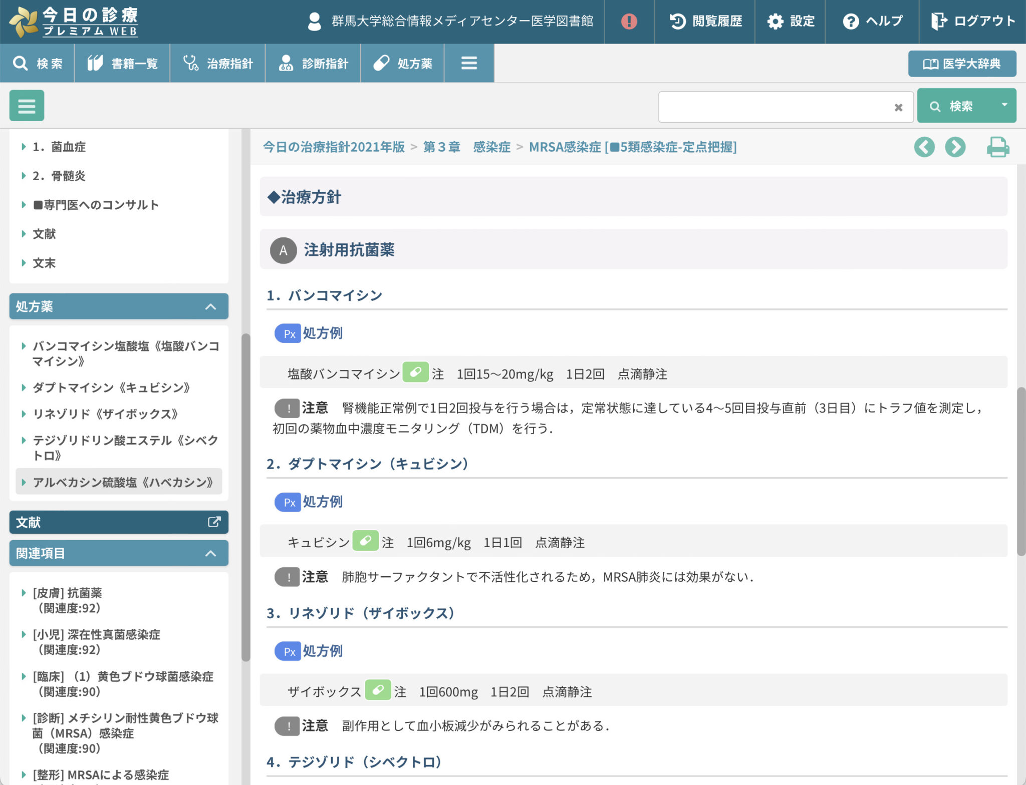 治療薬側からだけでなく、疾患の診療からもみてみよう。「今日の診療プレミアムWEB」で肺炎球菌感染症とMRSA感染症を確認するとこんな感じ: