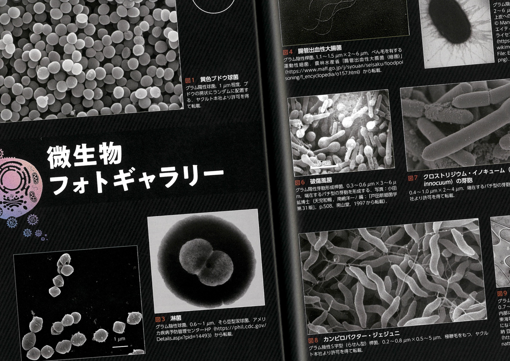 口絵に、いろいろな微生物の電子・光学顕微鏡写真がある。多くは他書からの引用だが、筆者自身のもある。(ヤクルトさんありがとう。「1000」の生産がんばって)