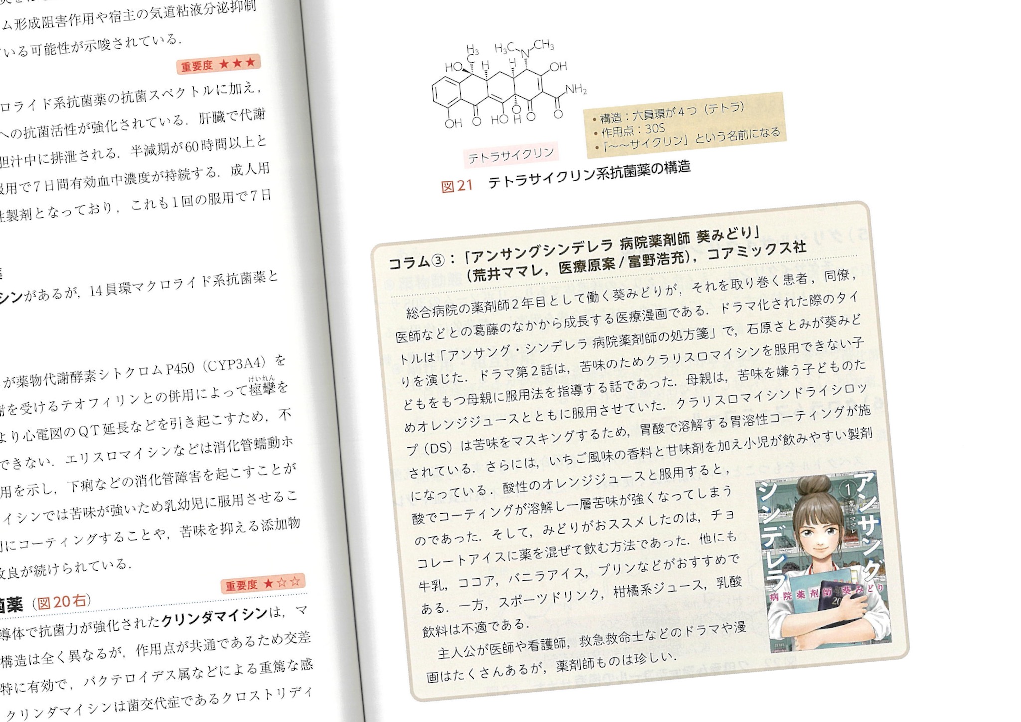 そんなところにときどきでてくる「コラム」が息抜きだ。微生物、感染症、薬学をテーマにしたマンガもとりあげられている。新薬は舐めて味をチェックする『アンサングシンデレラ』、血小板ちゃんのTIKTOKの『はたらく細胞』、かもせ〜の『もやしもん』。いずれも本学図書館に所蔵されている。