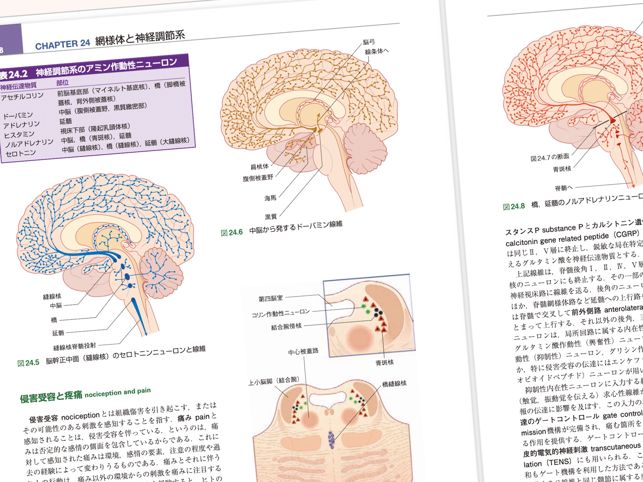 他の章でもカラフルなまとめの図がたくさんある。調節系(賦活系)など、文章の説明だけ、ごく簡単な模式図だけではふわっとしがちだが、本書の図はディテールまでよくまとまっていて、ピシッと把握できる。