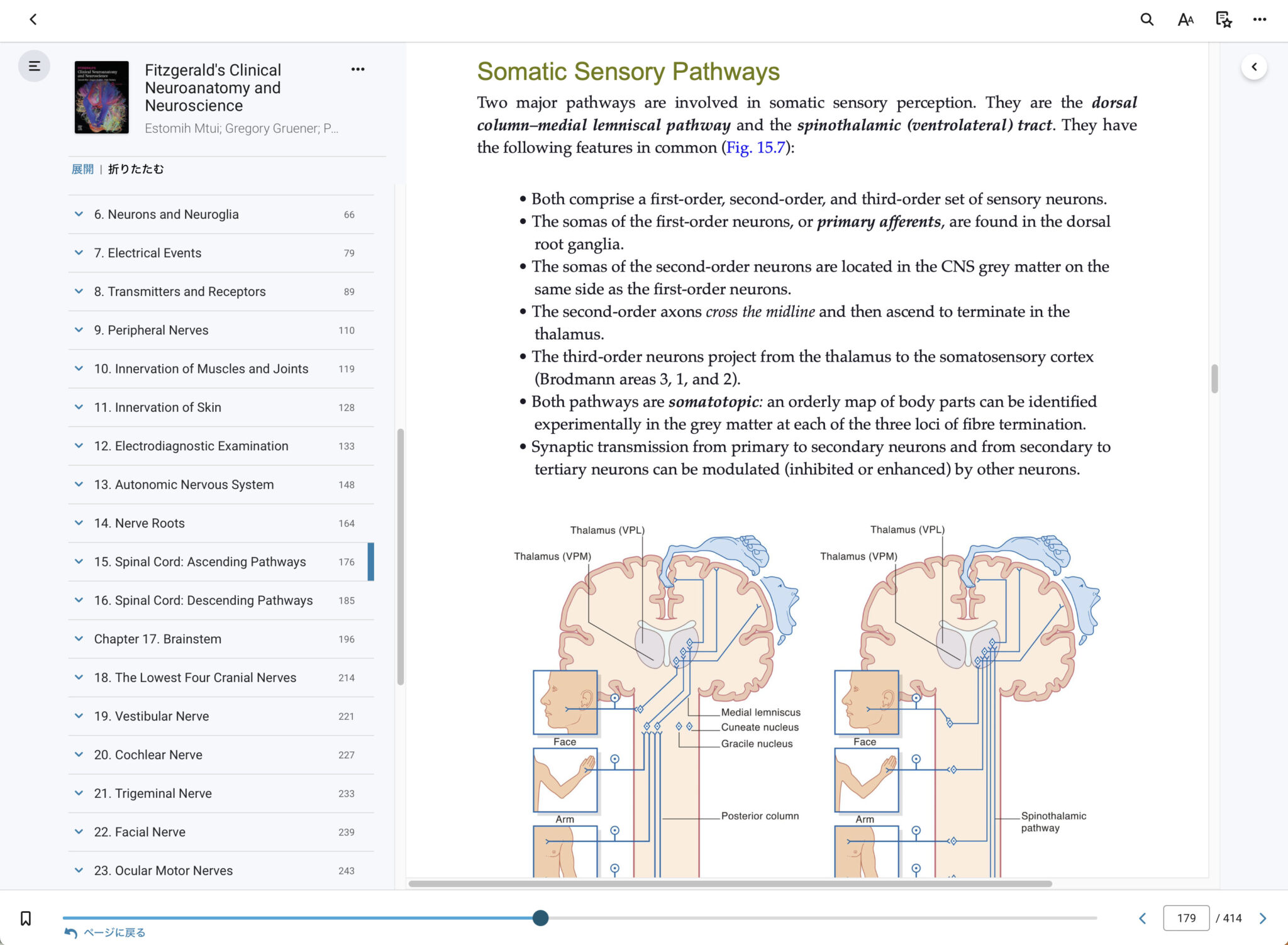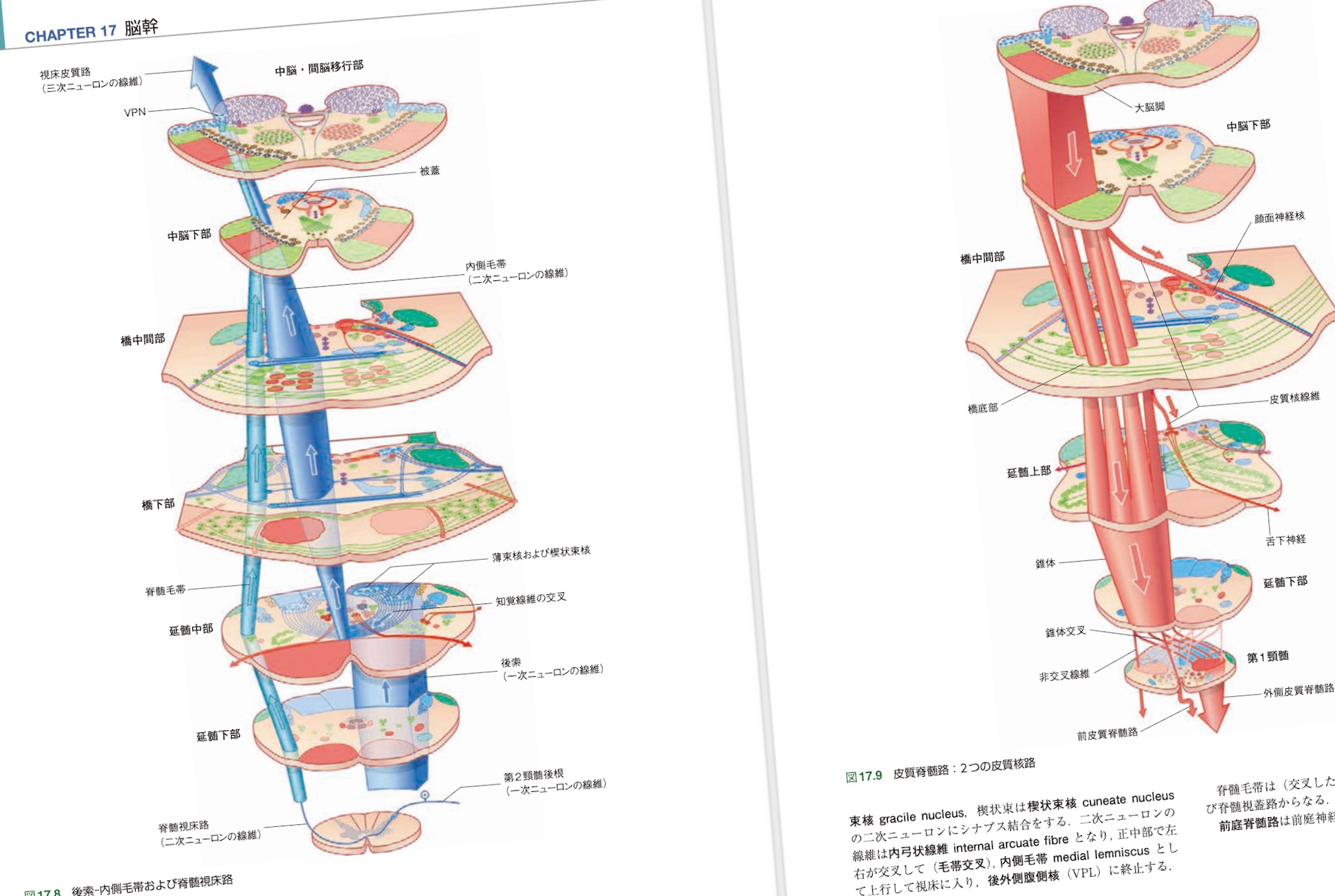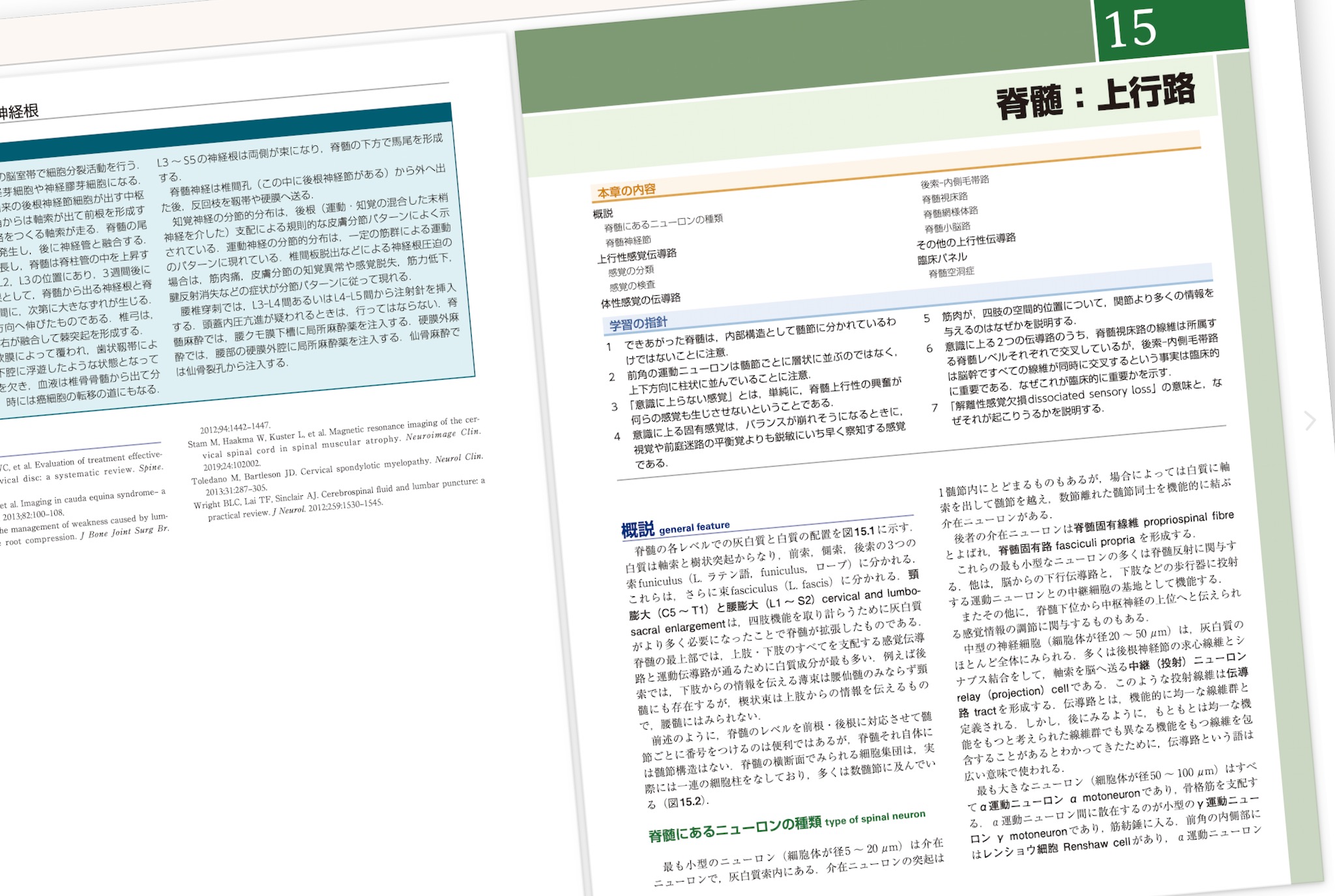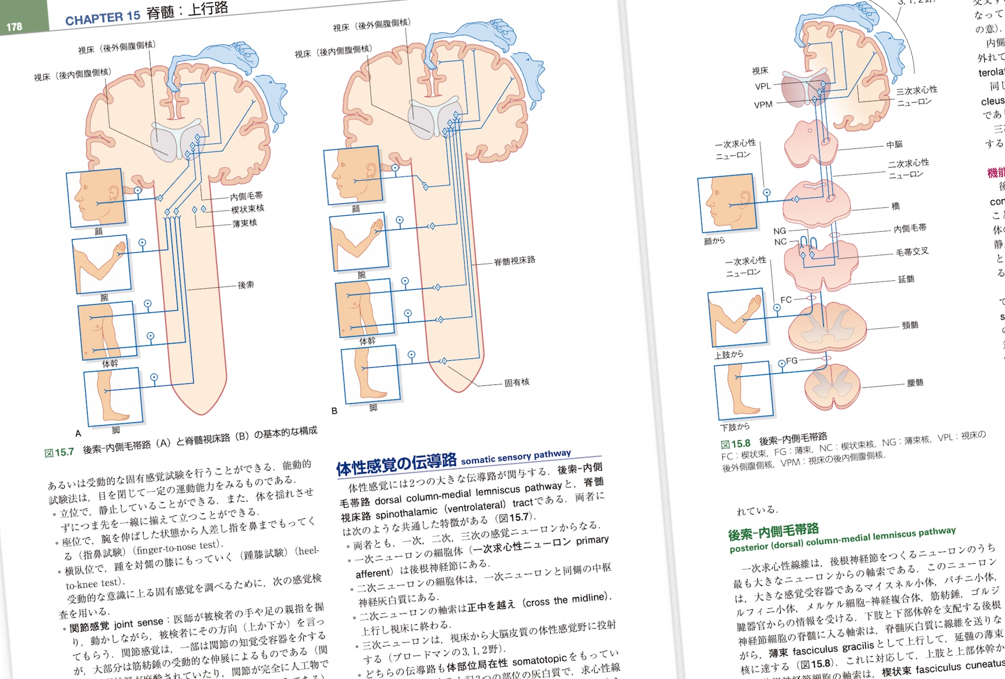 脊髄の上行路のところをみてみよう。最初のページに、学習目標と概説があり。各論が続く。伝導路の図が立体的で、神経束のボリュームまでみてとれる。