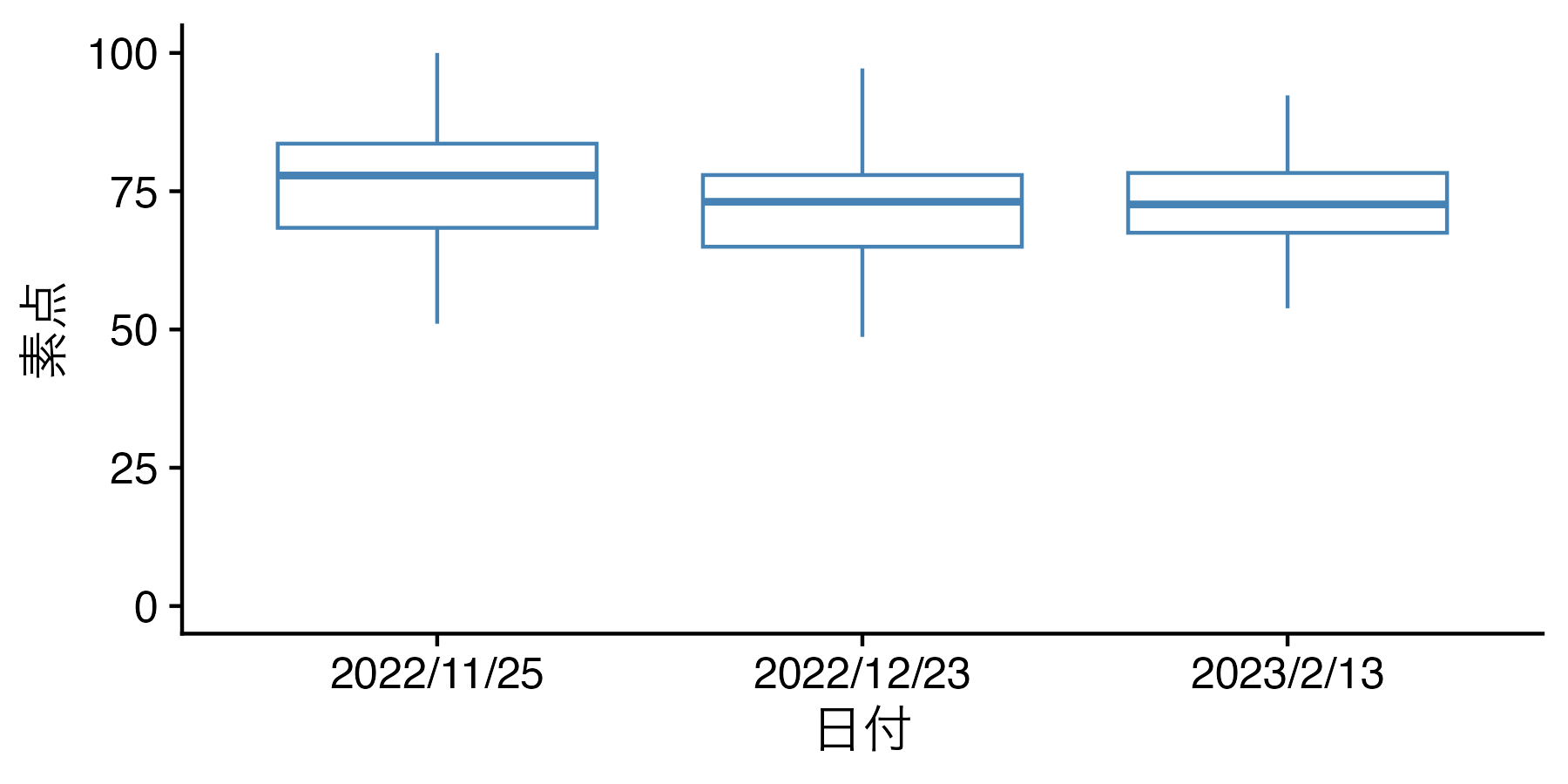 - 期末試験では、平均点に差はないものの、65~80に集中して分布するようになった。合否境界のひとたちががんばったようだ。