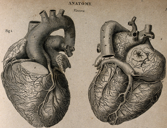V0008067 Human heart: four figures. Engraving by T. Milton, 1814