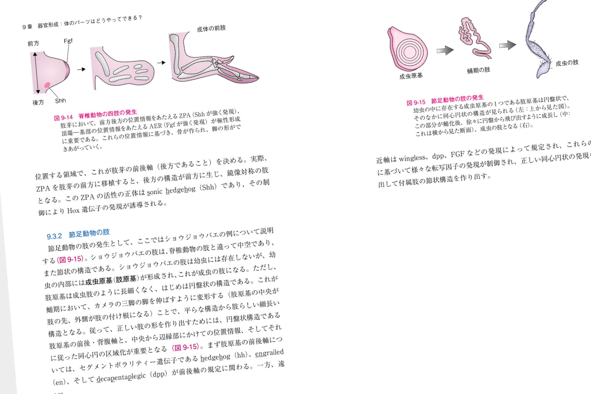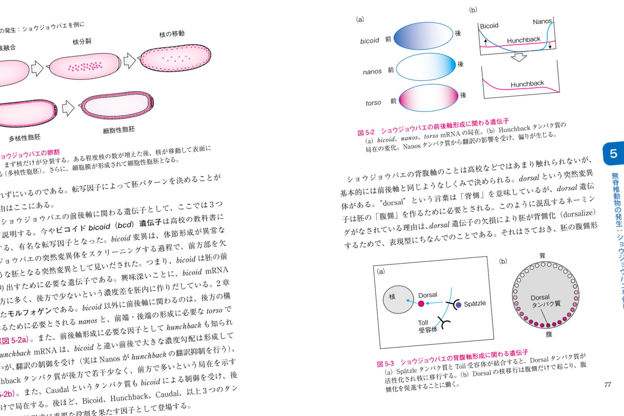 第5章からが発生生物学になる。何はともあれ、ショウジョウバエの研究で発見されたモルフォゲンやホメオティック遺伝子。そして、軸決定、誘導など、発生現象の基本に進み、器官形成へ。