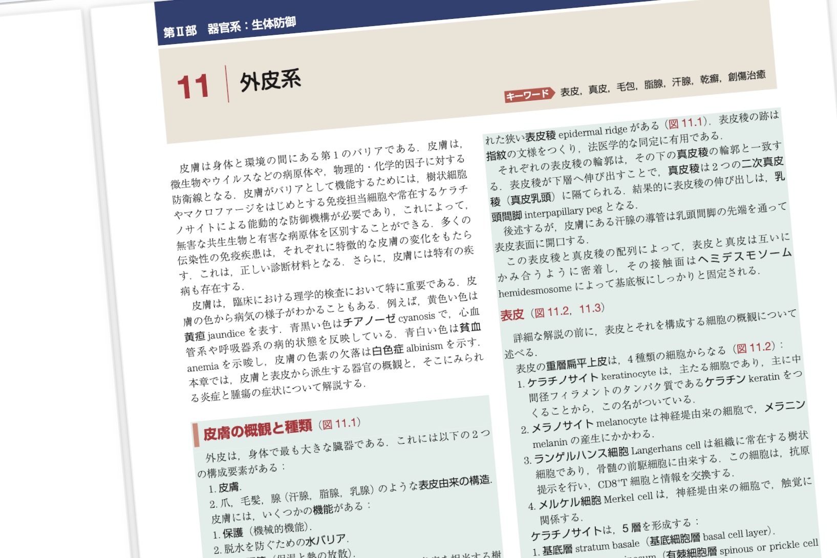 訳文は、日本語としてとても読みやすい、というほどではないにしろ、キチンと翻訳されていて、読んで理解するのに大丈夫なレベル。「皮膚は、臨床における理学的検査において特に重要」は、「患者さんの身体を調べて所見を取るときに、皮膚はとても大切」と脳内変換して理解できる —「Physical」の訳語に「身体の」ではなく「理学的」を充てる医系の習慣を、基礎医学を学ぶ段階で知っていればだけれども。