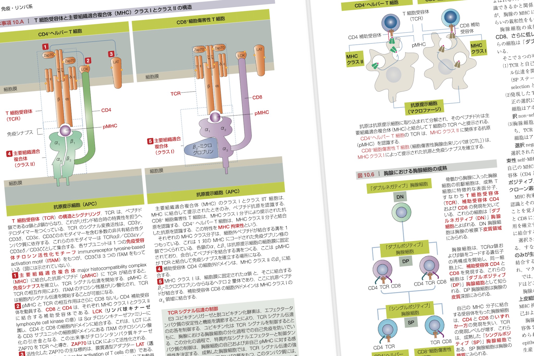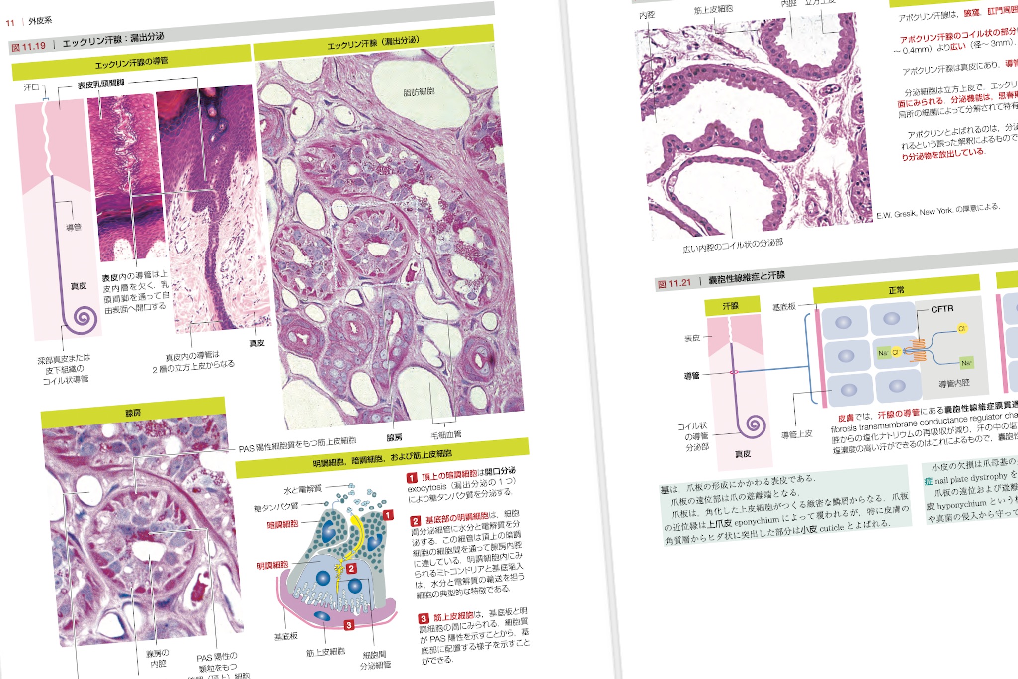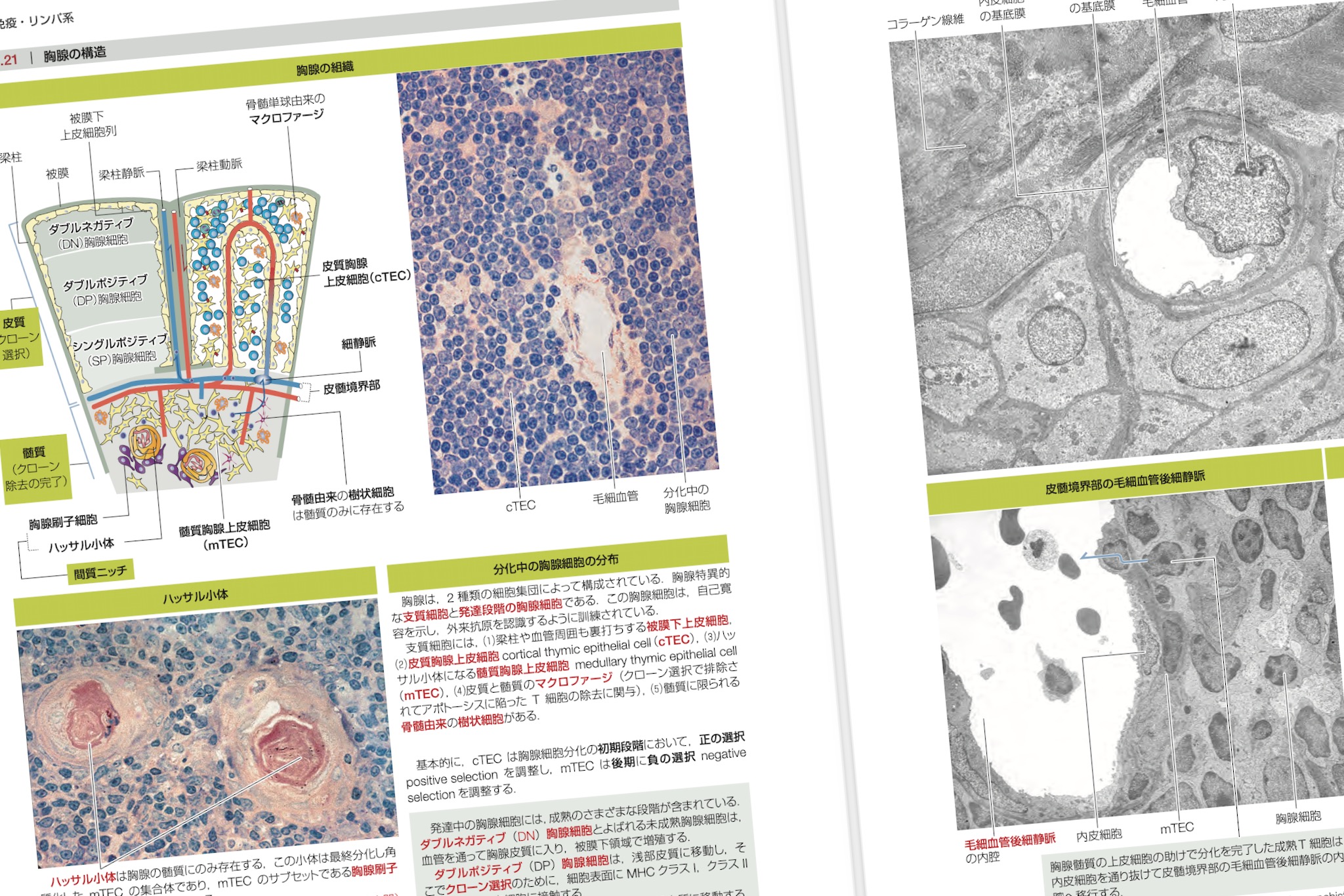 光学顕微鏡写真が大きくレイアウトされており、組織学実習でも役に立つ。適宜、電子顕微鏡写真もあり、光学顕微鏡では解像力が不足する構造もみてとれる。写真の読み取りを助ける模式図も的確だ。模式図には細胞生物学的な項目も描き込まれている。