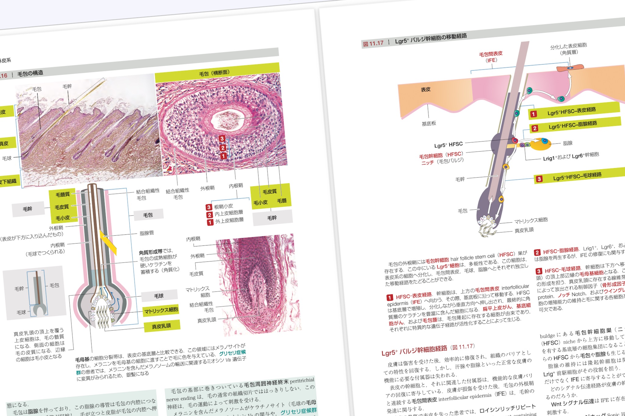 毛包の写真や図が多く、構造がみてとれるテキストは少ない。本書の図は十分で、これ以上の詳しい話し(内根鞘の内訳など)は知らないでも大丈夫。それよりも、分子機構や幹細胞の方を学べた方がいい。美容皮膚科でも使われる項目である。