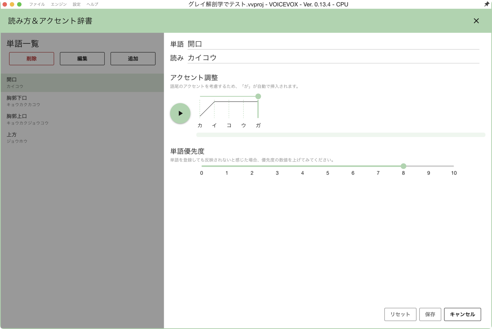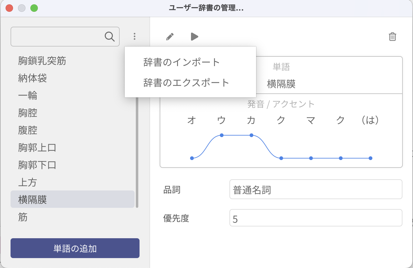 医学用語などの専門用語は読み間違うことが多い。読み間違うときには、ユーザー辞書に登録する。読みだけでなくイントネーションも定義できる。ユーザー辞書のインポートやエクスポートができる。
