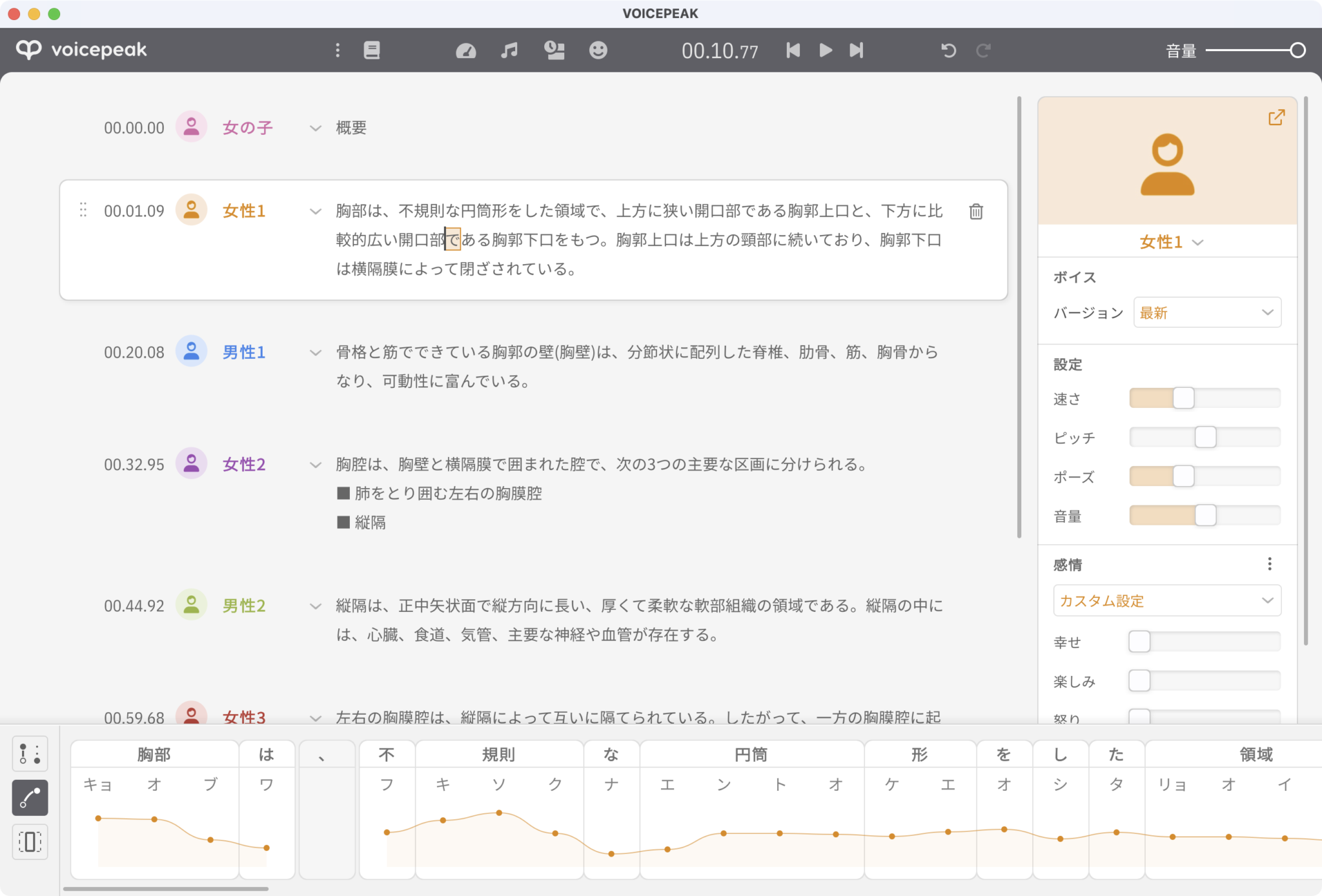 『グレイ解剖学 原著第4版』から、胸部の冒頭を音声にした。読み間違う部分はユーザー辞書で直してある。間合いを長めにし、感情を調節して元気な声にした。