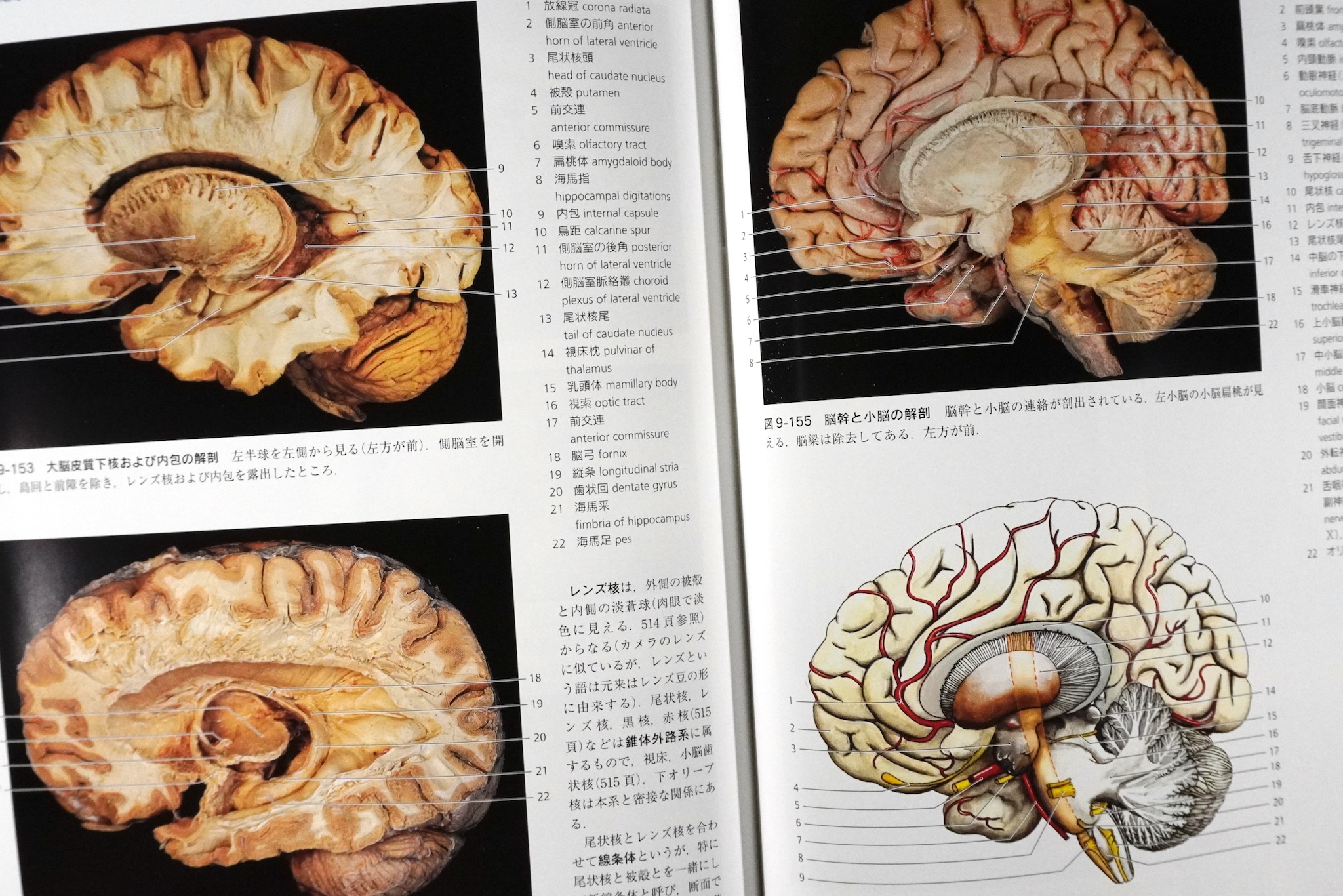本書には神経解剖学も含まれる。脳実習でも使える。脳を解剖するとき、脳実習では一通り(左右を別にすれば二通り)の剖出法しかできないが、本書では同じ部位をいろいろな「切り方」「裂き方」でみられる。