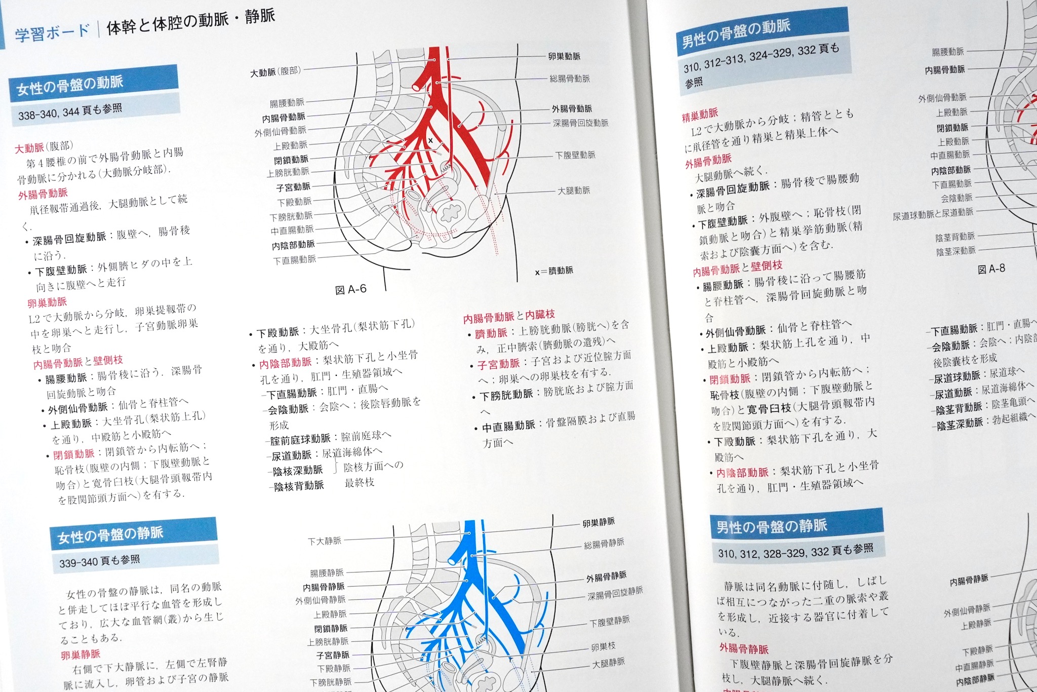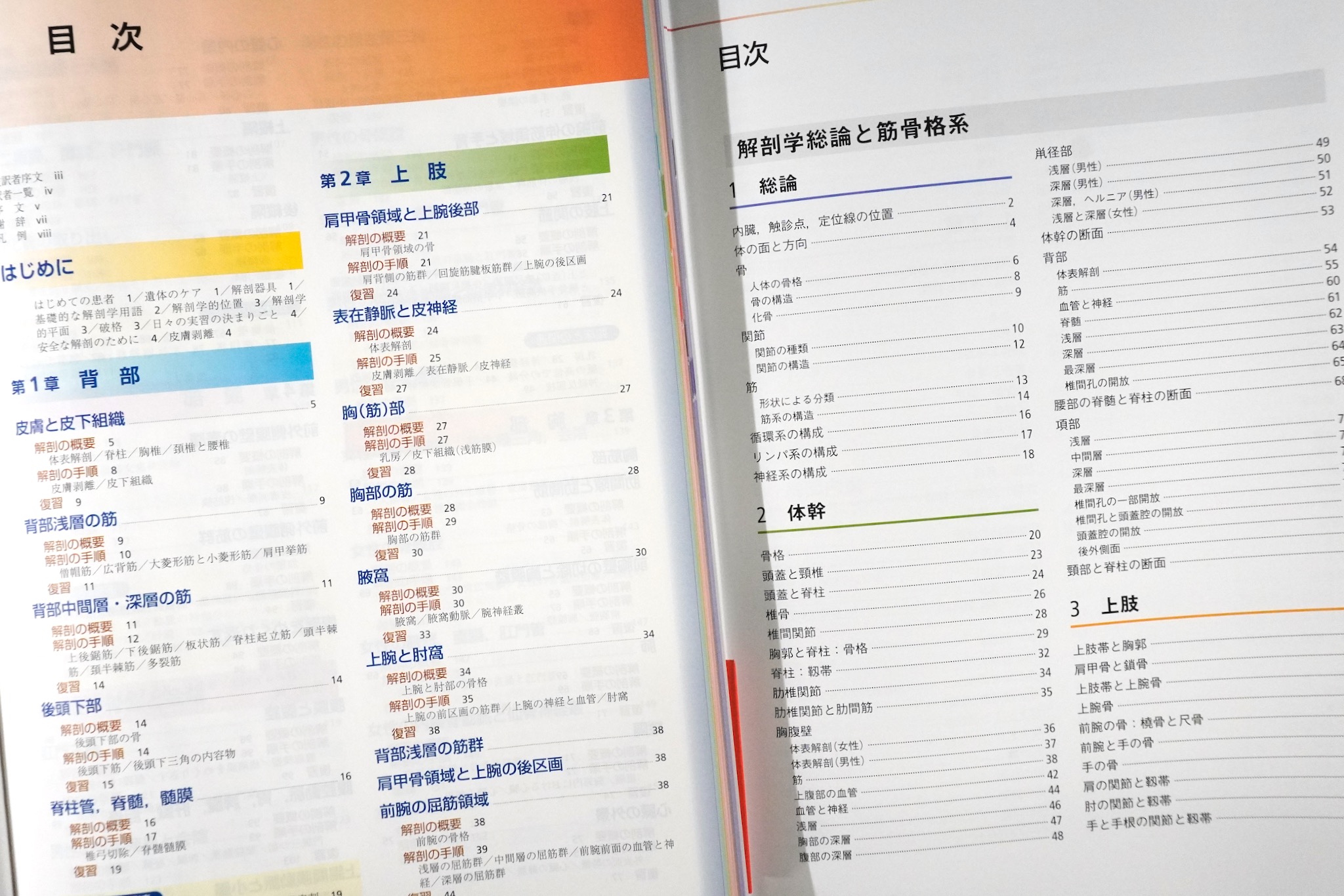 今回の改訂での大きな変更点は、章の順序が一般的な解剖実習の順序に倣って並べかえられたことだ。従来は人体の上から下の順に章が並んでいたが、第9版では、体幹→上肢→下肢→胸部→腹部…の順になっている。『グラント解剖学実習』とほぼ同じなので(下肢の順だけ違う)、実習中に参照しやすくなった。