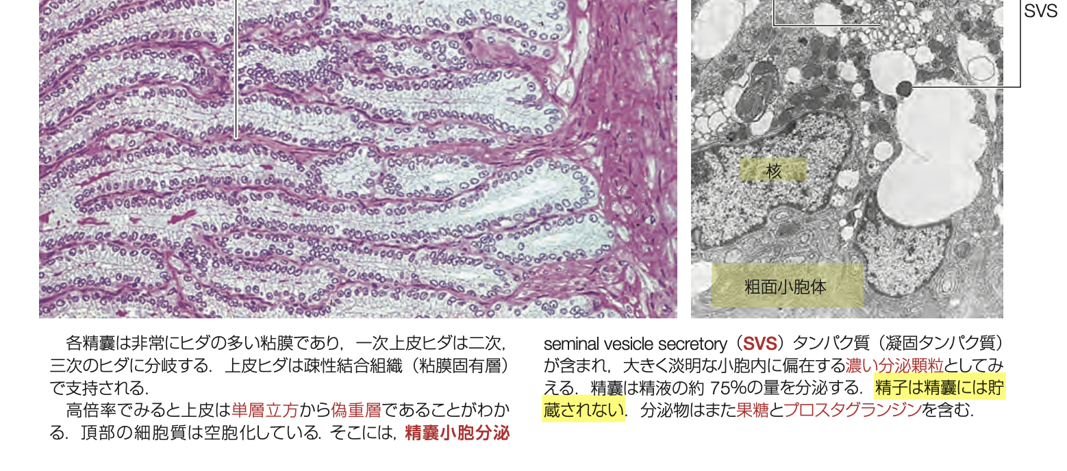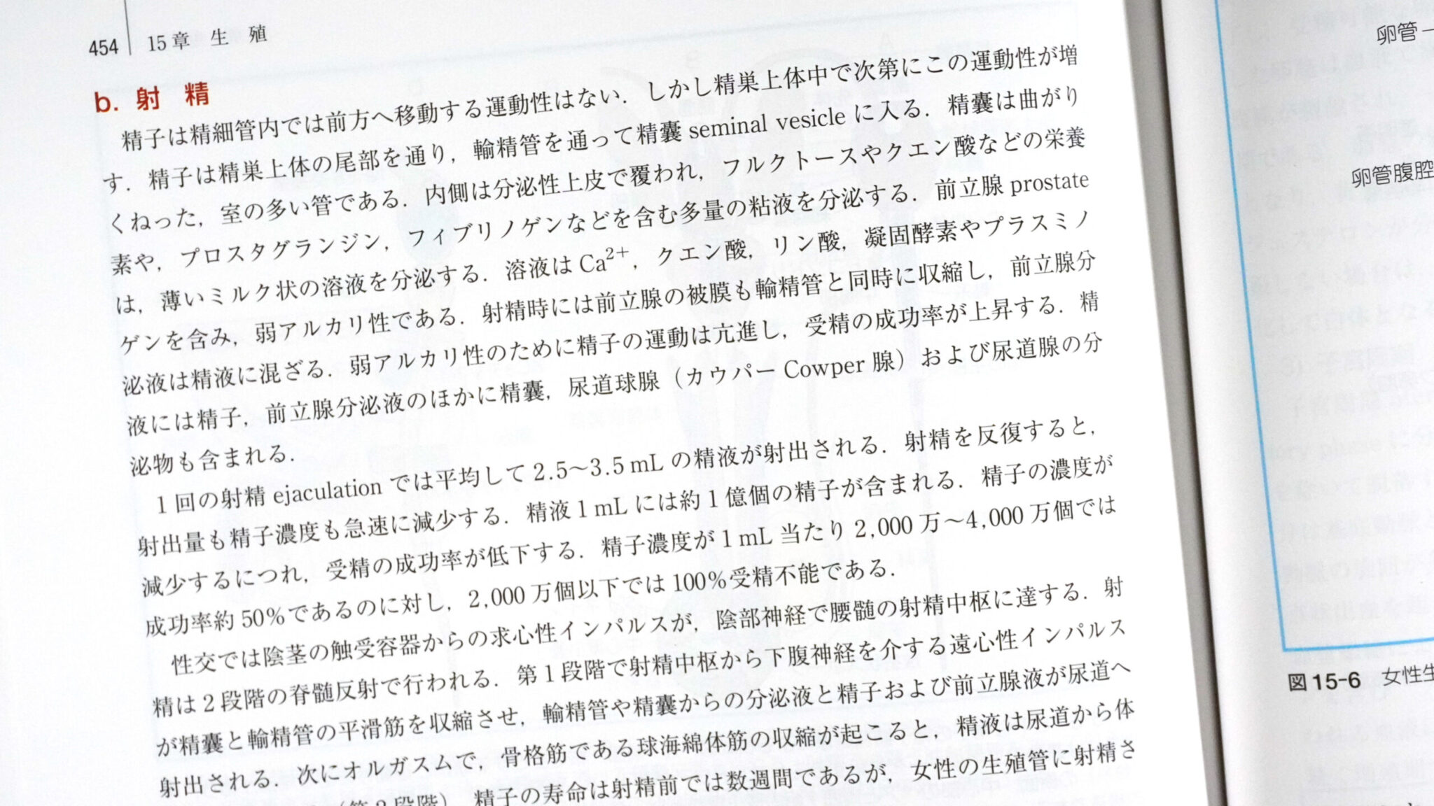 射精のメカニズムは他書とは異なる。精子が精嚢に入ると記載されているけれども、精嚢は精液の液体成分の7〜8割をつくる外分泌腺で、精子を貯蔵する器官とは考えられていない。