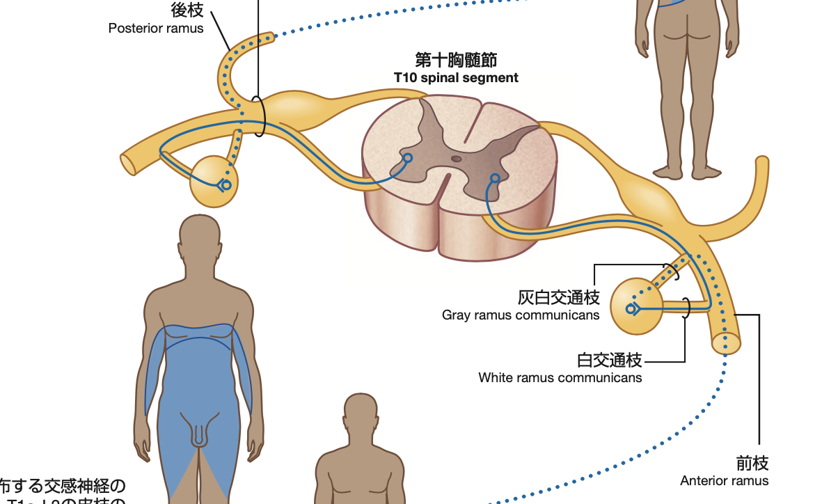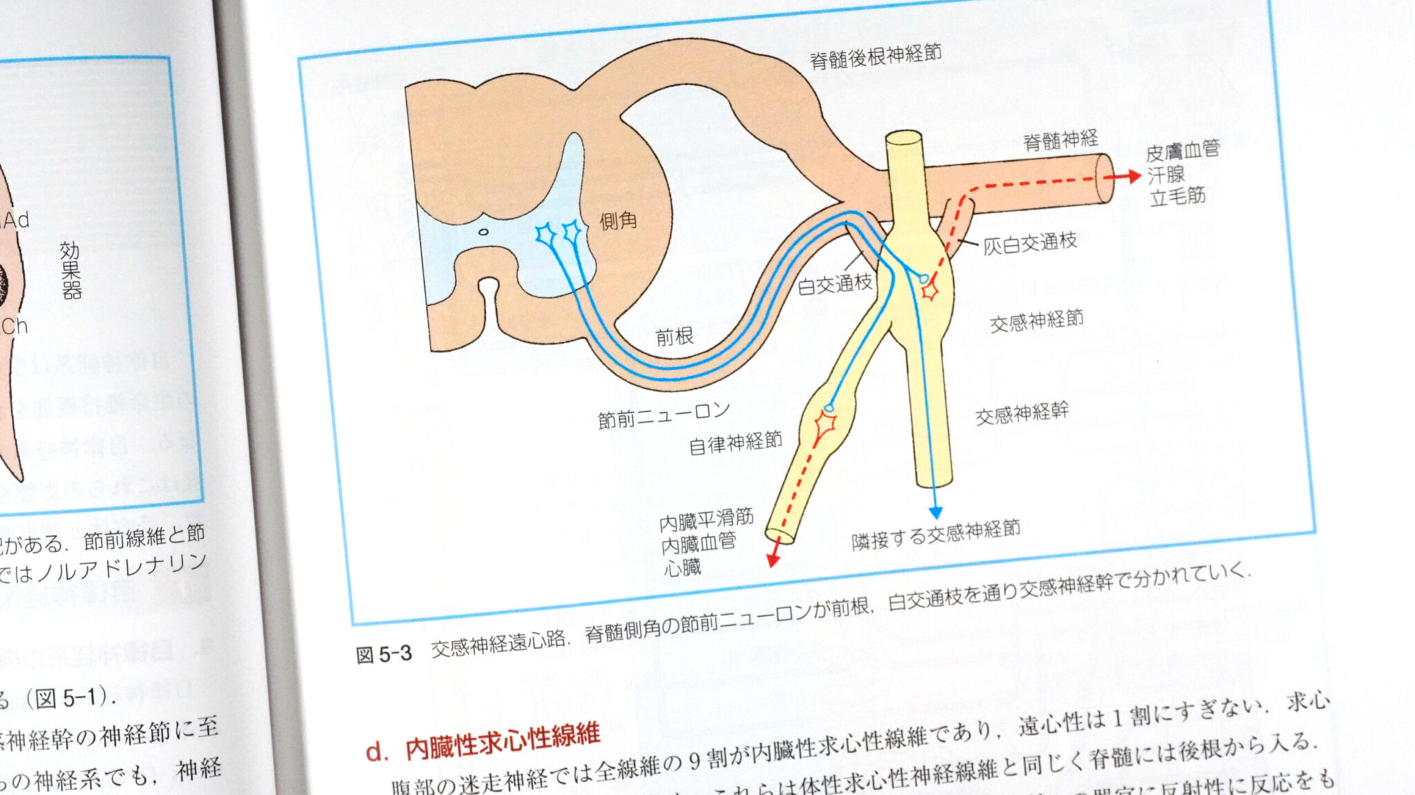 自律神経系の説明には遠心性線維だけでなく求心性線維も含めてある。白交通枝と灰白交通枝の図は、『グレイ』などとはちょっと違う。