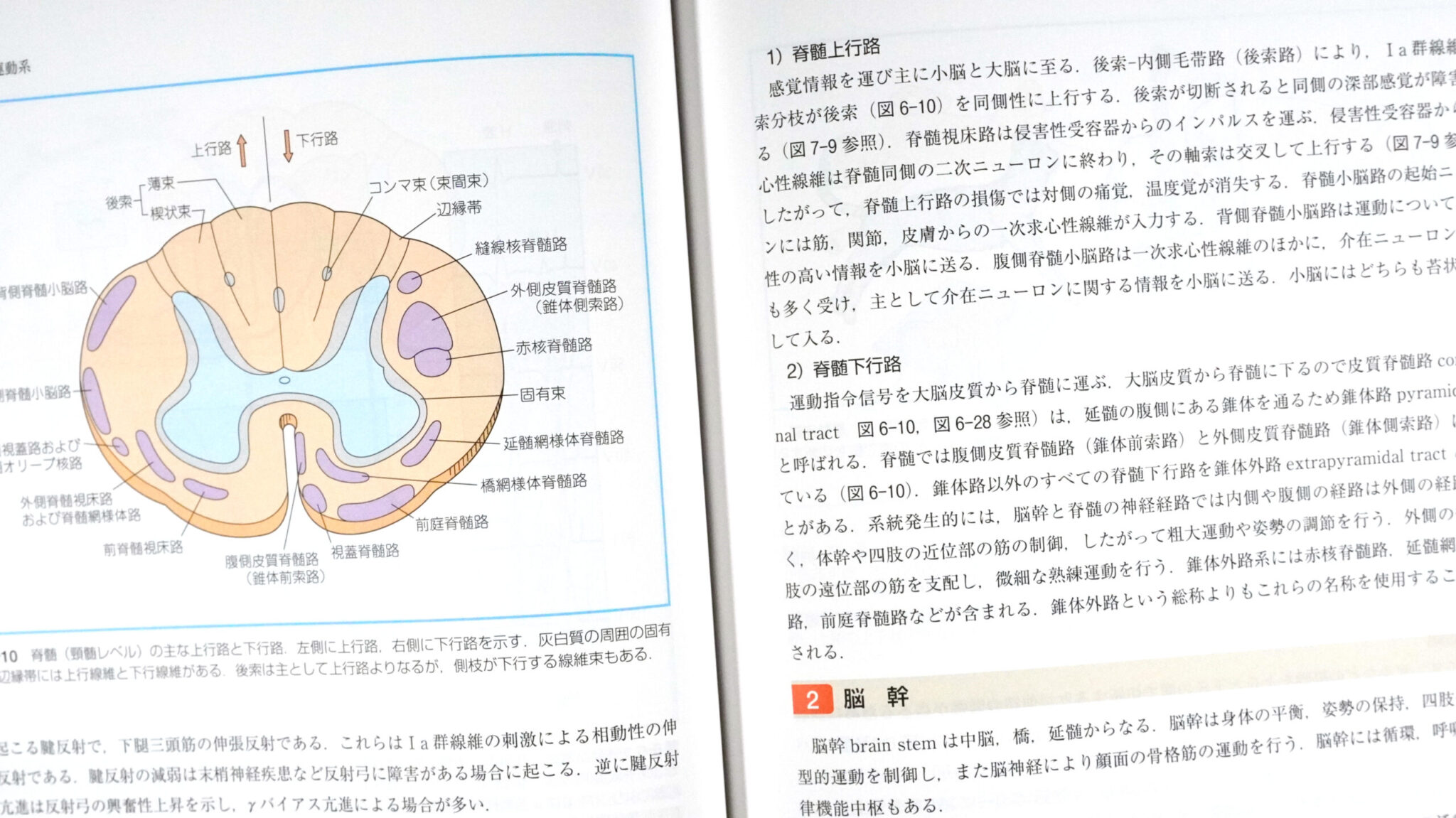 脊髄の伝導路は脊髄のところで、上行路・下行路ともに説明される。損傷の上位と下位とでどうなるか、というような話と結びつけるには、全体を読む必要がある。