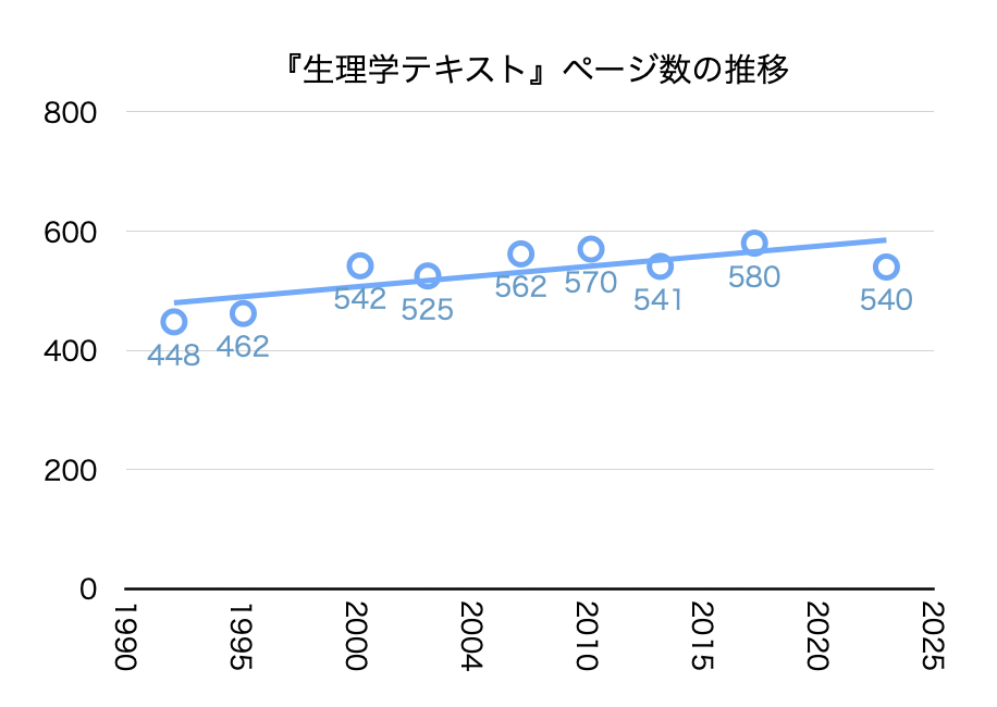 『生理学テキスト』は通読できる教科書として企画されたという。実際、初期はコンパクトだ。数年ごとに改版され、生理学自体の発展に伴って本の分量も増加傾向だ。
