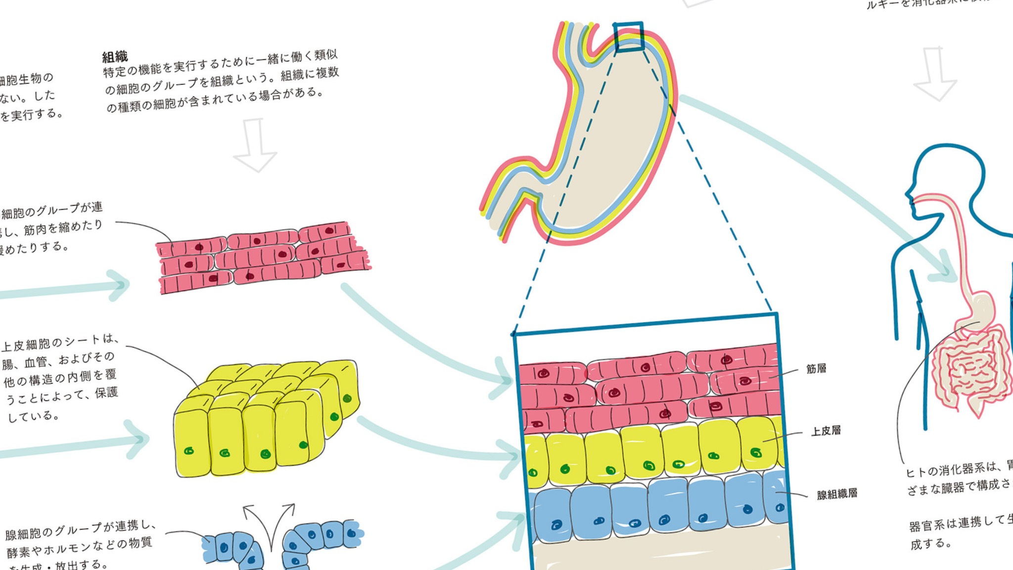 筆者はもと分子生物学のひとだったので、解剖学や組織学にはこだわりがないのかもしれない。とはいえ、胃壁の模式図はデタラメだ。筋、上皮、腺という分類もよく分からない。組織を構成する要素というなら、筋、上皮、神経、結合組織だろう。